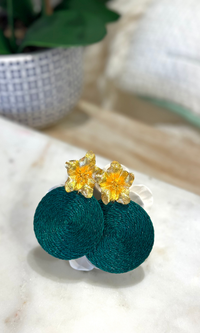 Treat yourself to these stunning earrings. This intricate design includes a shimmering gold flower with a palm statement piece hanging underneath. The flower petals have intricate details, making this piece unique and captivating. They'll be the perfect statement to your daily or evening look.