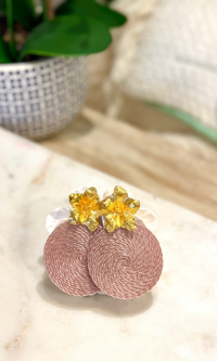 Treat yourself to these stunning earrings. This intricate design includes a shimmering gold flower with a palm statement piece hanging underneath. The flower petals have intricate details, making this piece unique and captivating. They'll be the perfect statement to your daily or evening look.