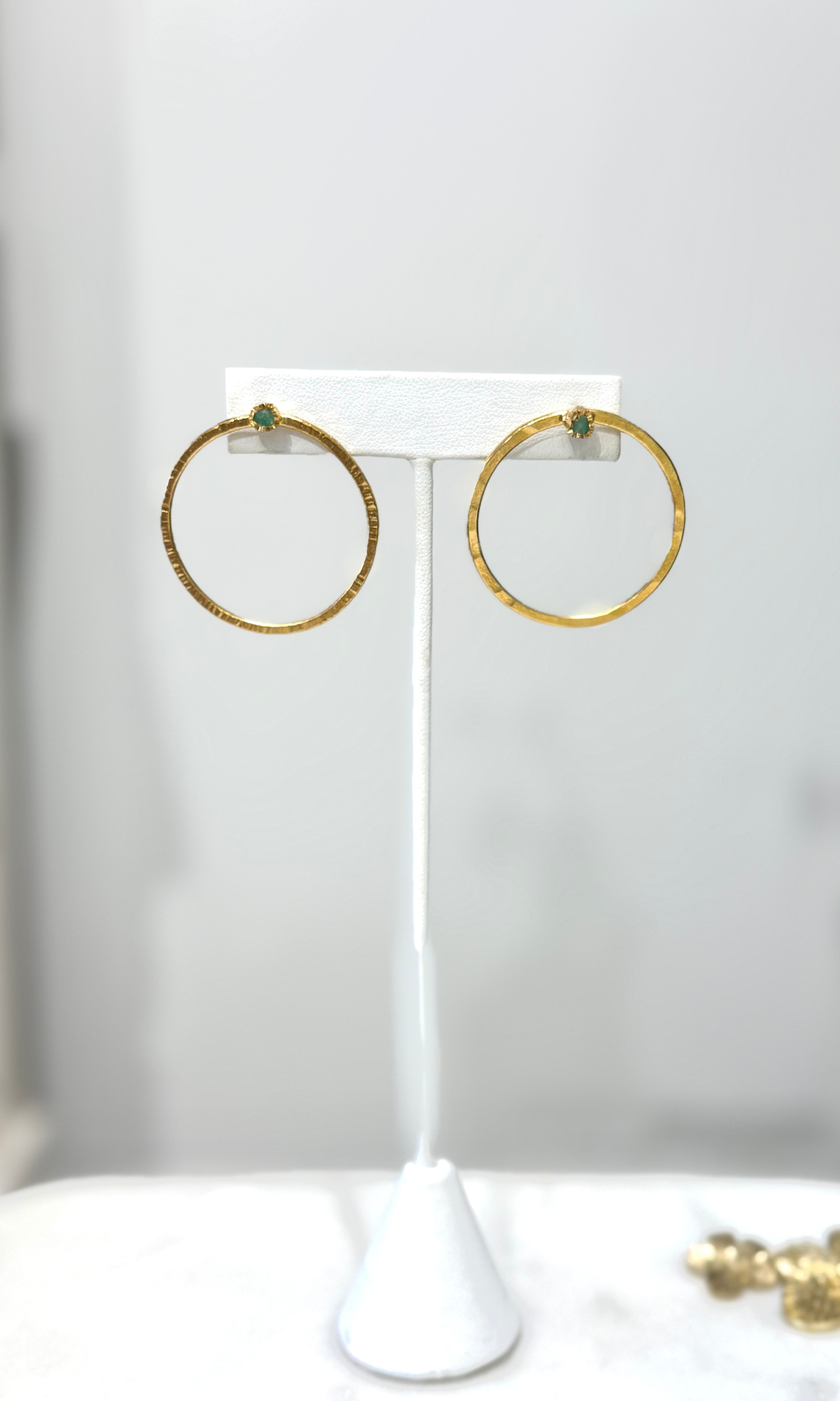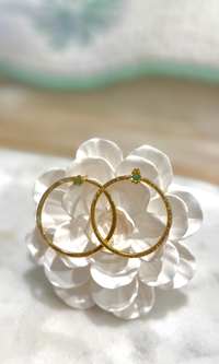 Treat yourself to these stunning earrings. This intricate design includes a shimmering gold hoop with an emerald stone at the top. These hoops will be the perfect statement to your daily or evening look.