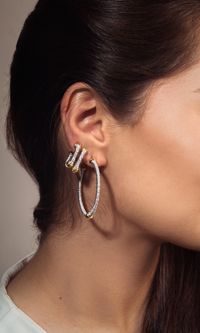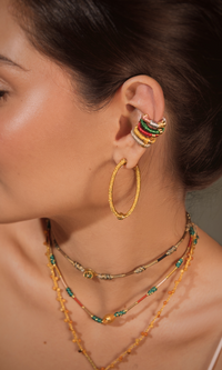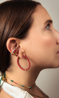 Treat yourself to these stunning cuffs. This intricate handmade design includes 18k gold plated hoops wrapped in shimmering threads. You can wear them alone or pair them with other Majulu products for a unique design. They'll add the perfect touch to your daily or evening look.