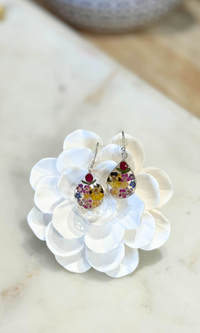 Treat yourself to these stunning earrings. This intricate design includes pressed aritsan flowers from mexico. The intricate detail adds the perfect, unique touch of elegance. They'll be the perfect statement to your daily or evening look. Purchase the matching necklace to complete the look.