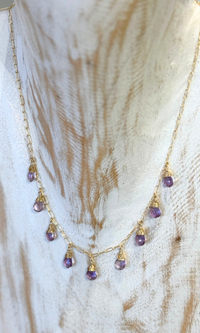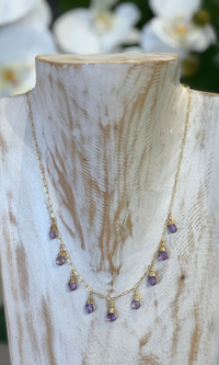 Treat yourself to this amethyst crystal necklace that has hanging stones on a gold plated chain. This delicate design is perfect for a night out.