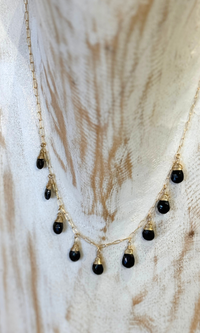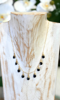 Treat yourself to this black opal necklace that has hanging stones on a gold plated chain. This delicate design is perfect for a night out.