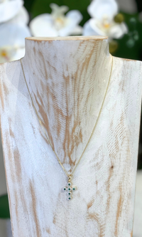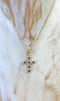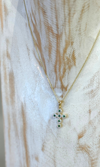 Treat yourself to delicate and sparkly cross necklace. It has diamonds made out of cubic zirconia that sparkle in the light and emeralds that add a unique touch to the design.