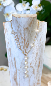 Treat yourself to this stunning chunky pearl necklace. This intricate design includes larger pearls beaded along a gold plated necklace. The necklace creates a lariat shape that hangs nicely with high-neck or v-neck tops.