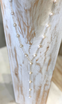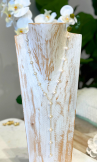 Treat yourself to this stunning pearl necklace. This intricate design includes a delicate pearl beaded along a gold plated necklace. The necklace creates a lariat shape that hands nicely with high-neck or v-neck tops.