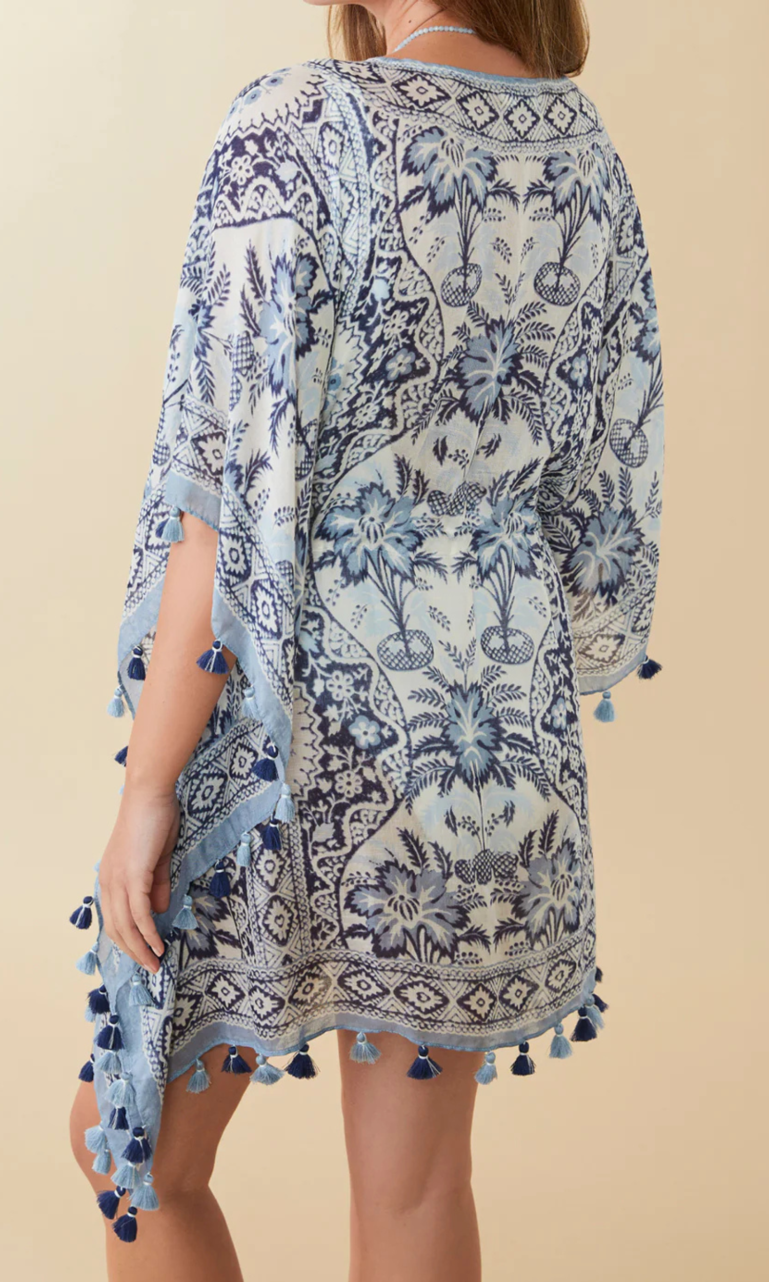 Elevate your beach or pool attire with the classic sophistication of our Naples Blue Cover-Up. With such a beautiful pattern, we might as well call this Beach Cover Up a show-off! Accented with fluttering tassel trim, this flowy, V-neck pullover easily cinches to fit with a tasseled drawstring.
