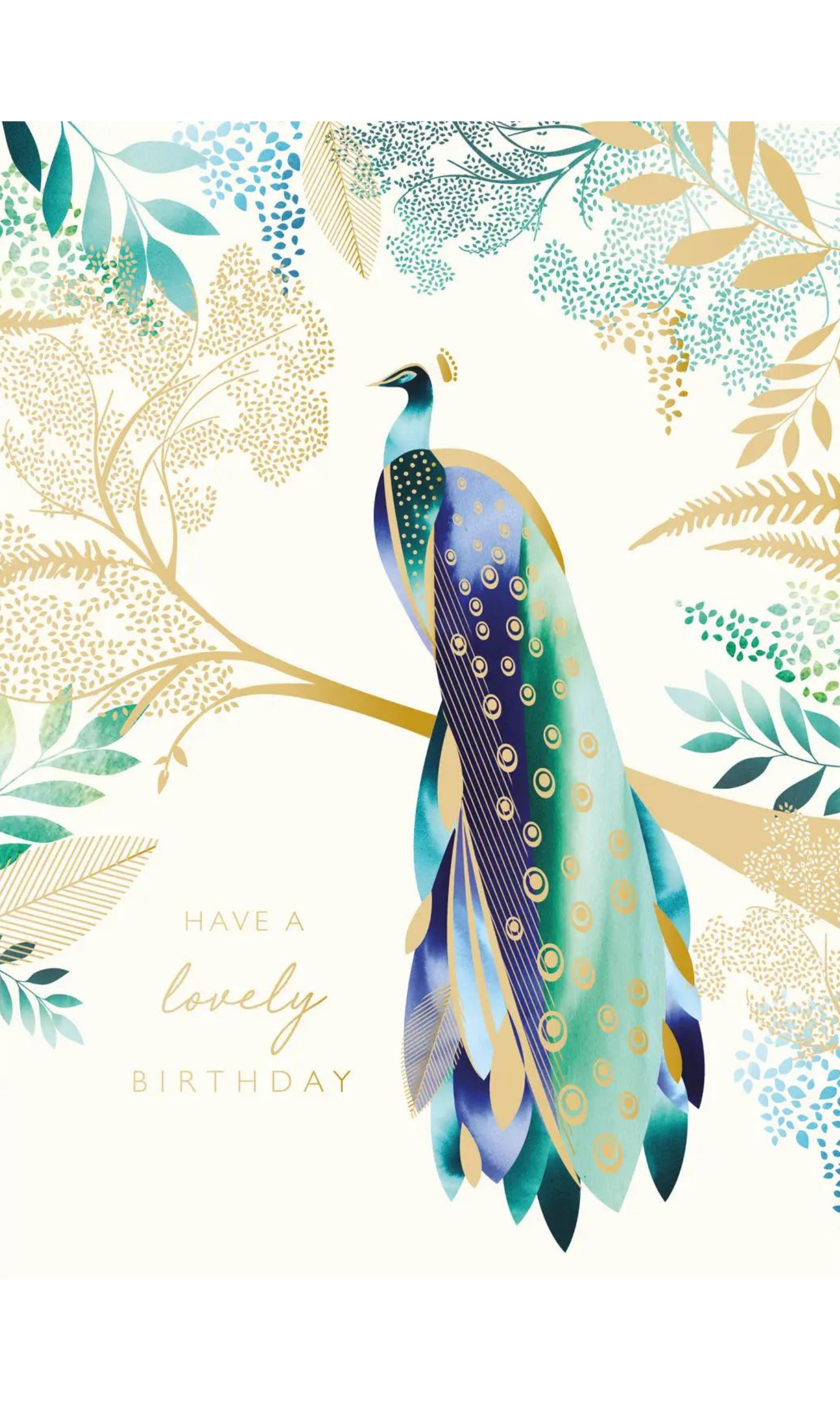 Peacock Birthday Card, featuring majestic tropical designs with elegant gold foil detailing, adorned with a charming peacock motif fit for royalty. A captivating choice for adding a touch of elegance to a birthday celebration.