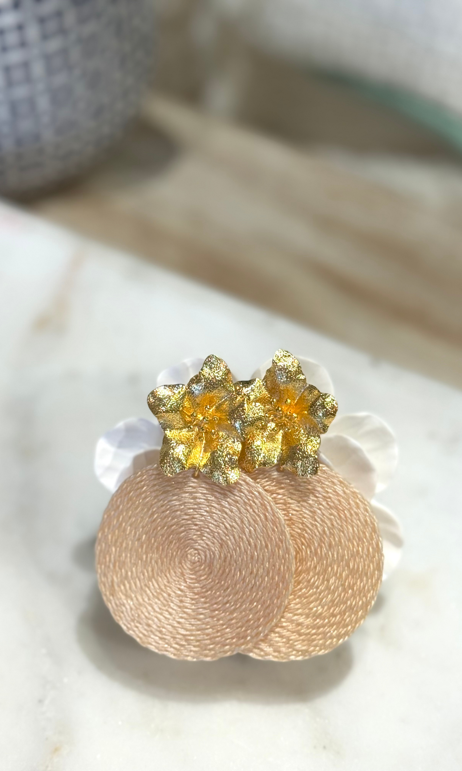 Treat yourself to these stunning earrings. This intricate design includes a shimmering gold flower with a palm statement piece hanging underneath. The flower petals have intricate details, making this piece unique and captivating. They'll be the perfect statement to your daily or evening look.