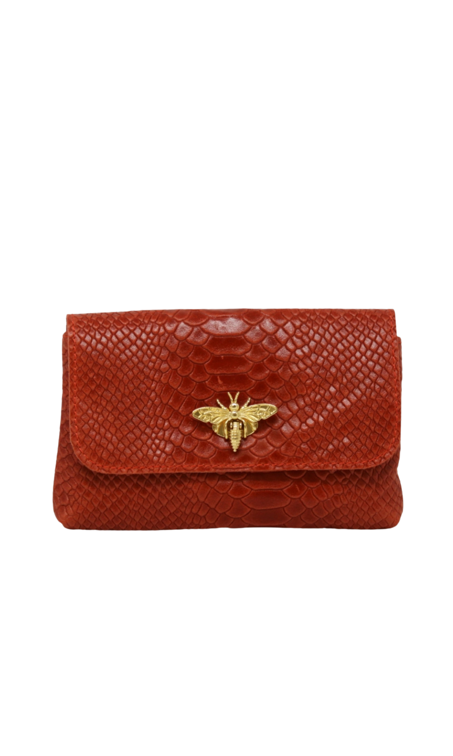 This handbag is a versatile leather piece imported from Italy that can be used as a clutch, wristlet, or crossbody. It features a a bee clasp, and three different handle options. This purse is made out of a high-quality, delicate textured leather. This accessory isn't just a bag; it's a statement that carries elegance with you.