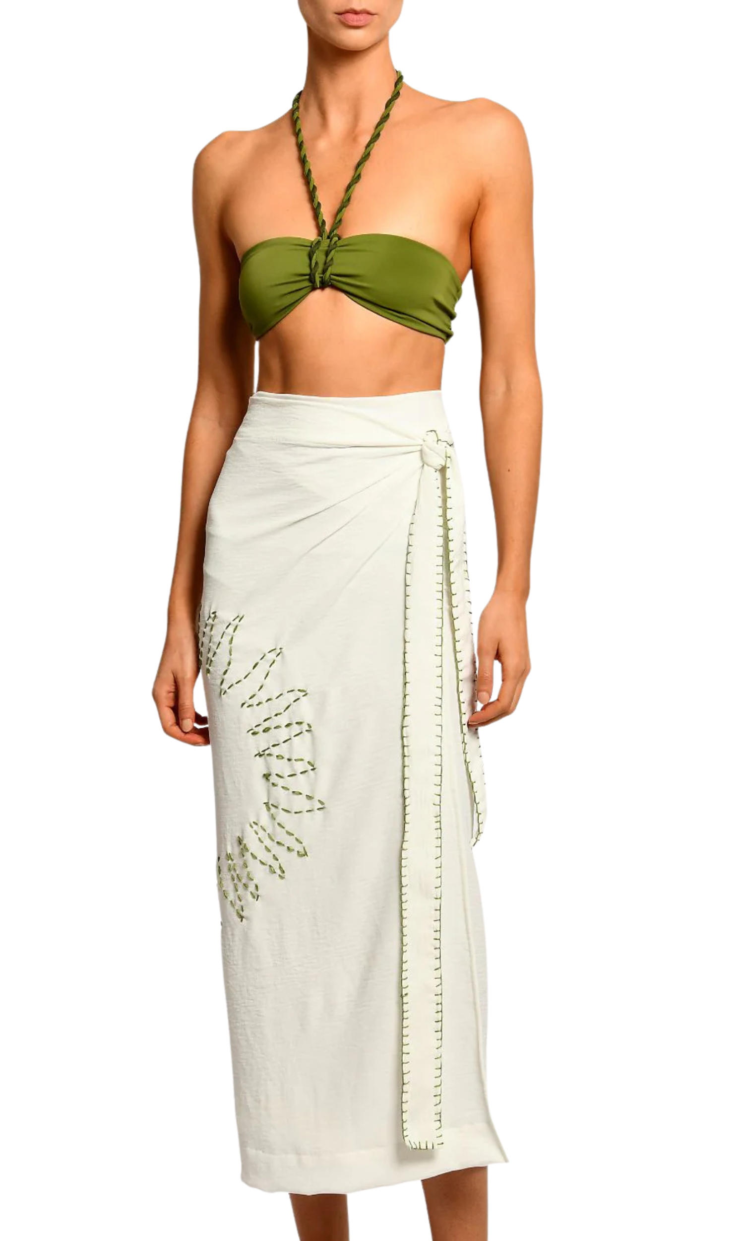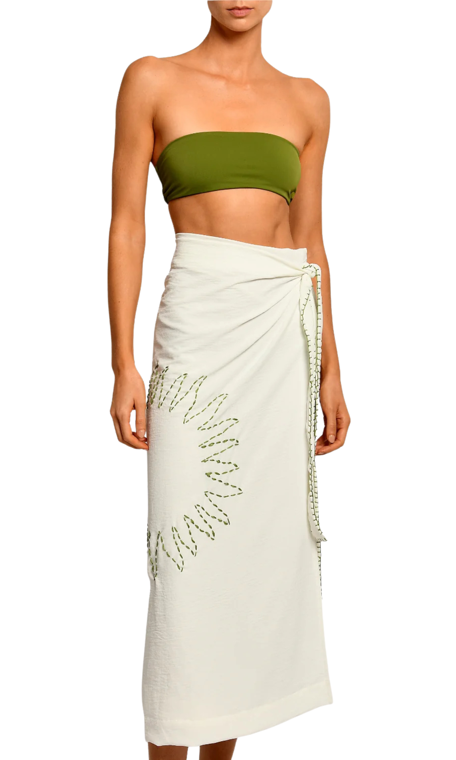 Wrap yourself in our Aurora Ivory Solaris Sarong. Midi-length wrap skirt made from a soft, lightweight fabric. Ties at the waist for an adjustable, comfortable fit. Features hand-stitched green embroidery for a natural and elevated look. Ideal for beachside styling or for adding a relaxed yet refined touch to your summer outfits.