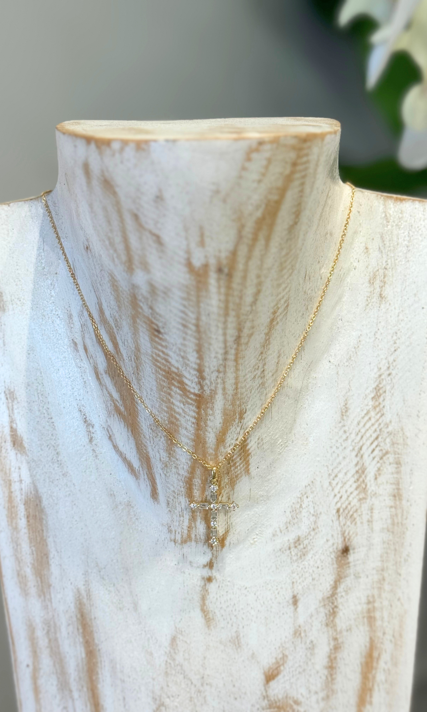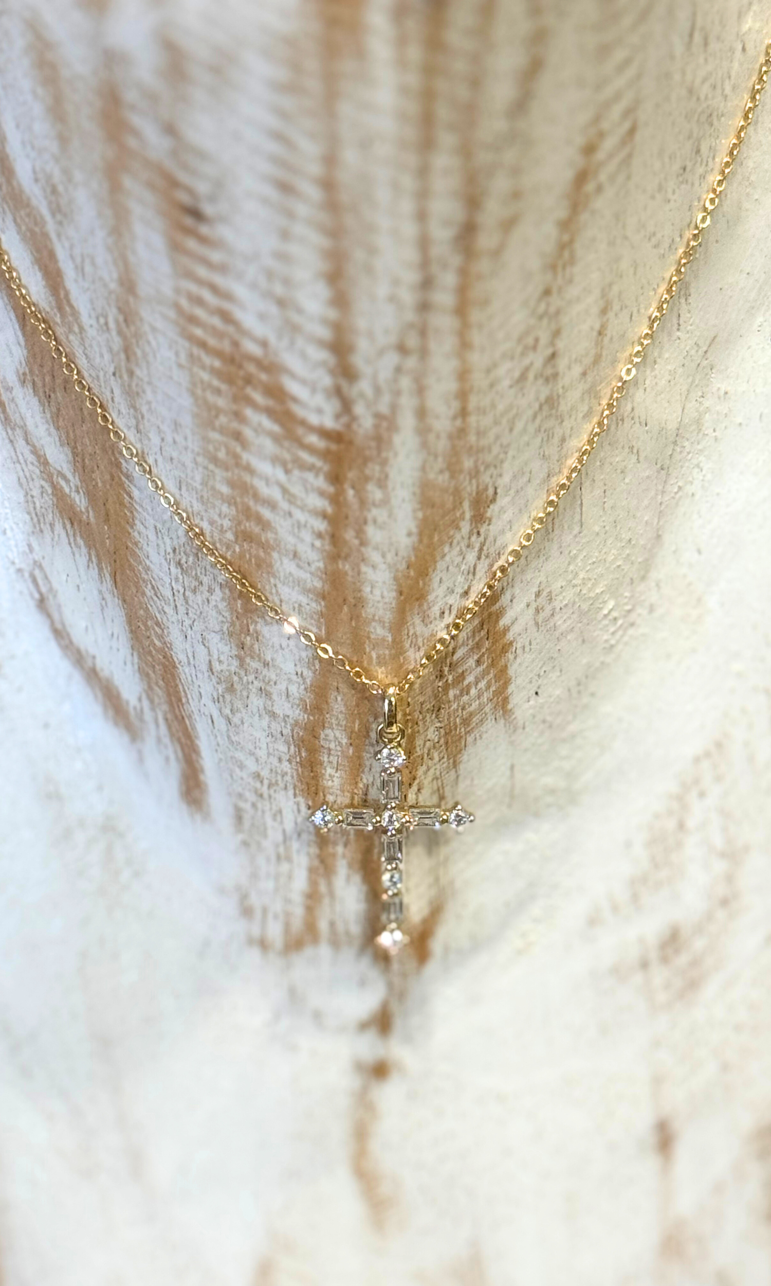 Treat yourself to delicate and sparkly cross necklace. It has baguette diamonds made out of cubic zirconia; white and sparkle in the light, they add a unique touch to the design.