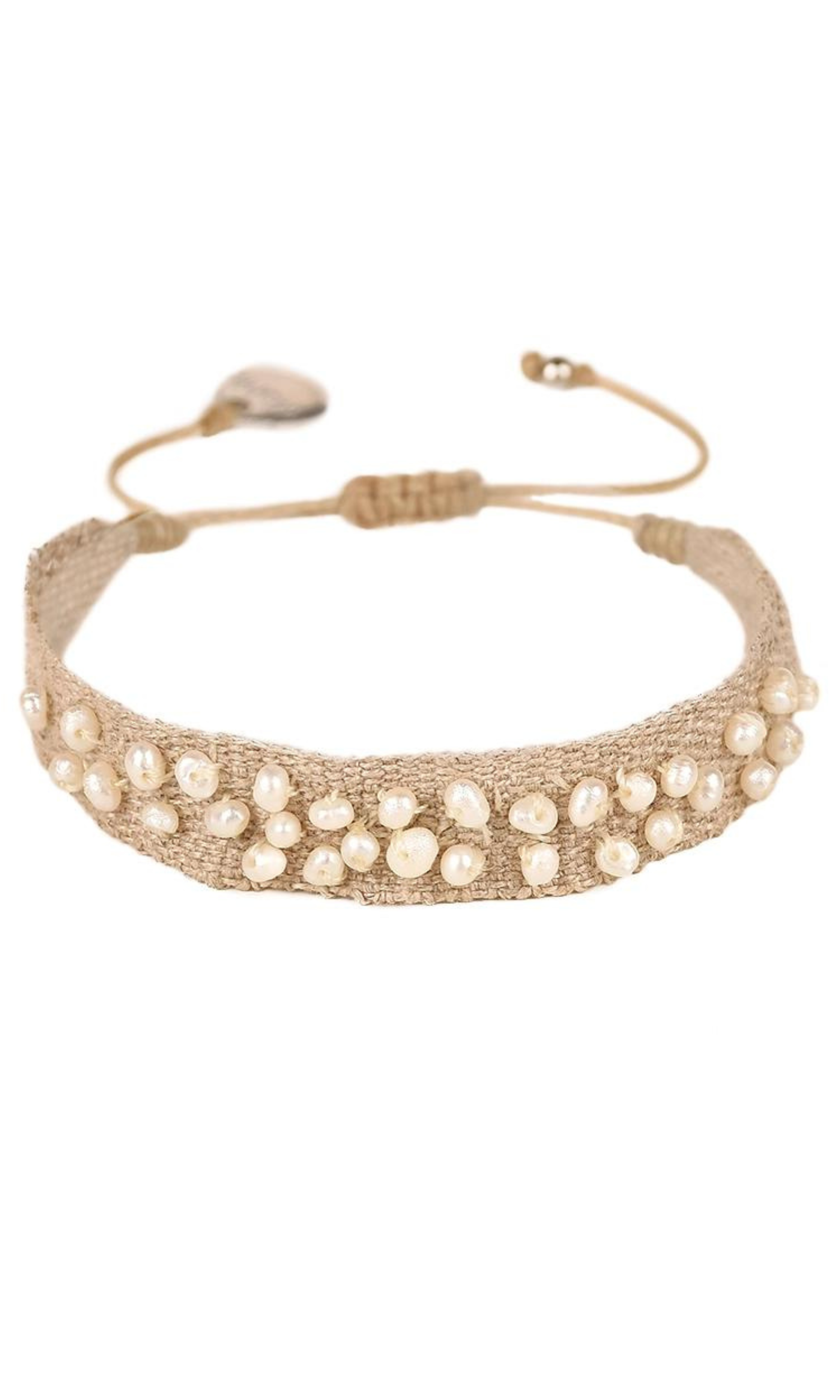 This linen fabric bracelet features embroidered beads across the top, offering a stylish and heartfelt accessory perfect for everyday wear.