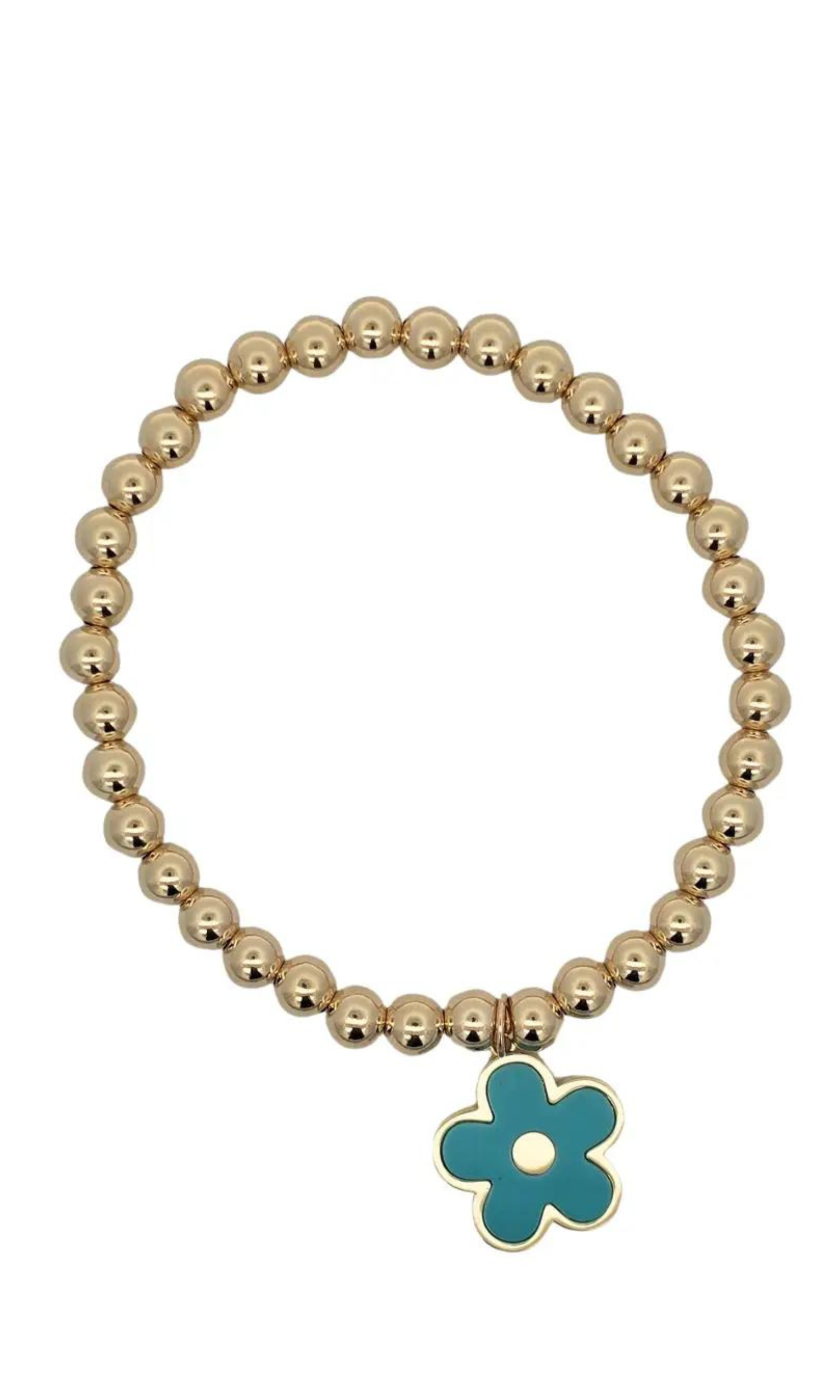 This simple beaded bracelet is perfect for adding a dainty accessory to your wrist. This bracelet features a dangling flower in between gold beads. Wear it alone or stack it with our bracelets for the perfect arm party.