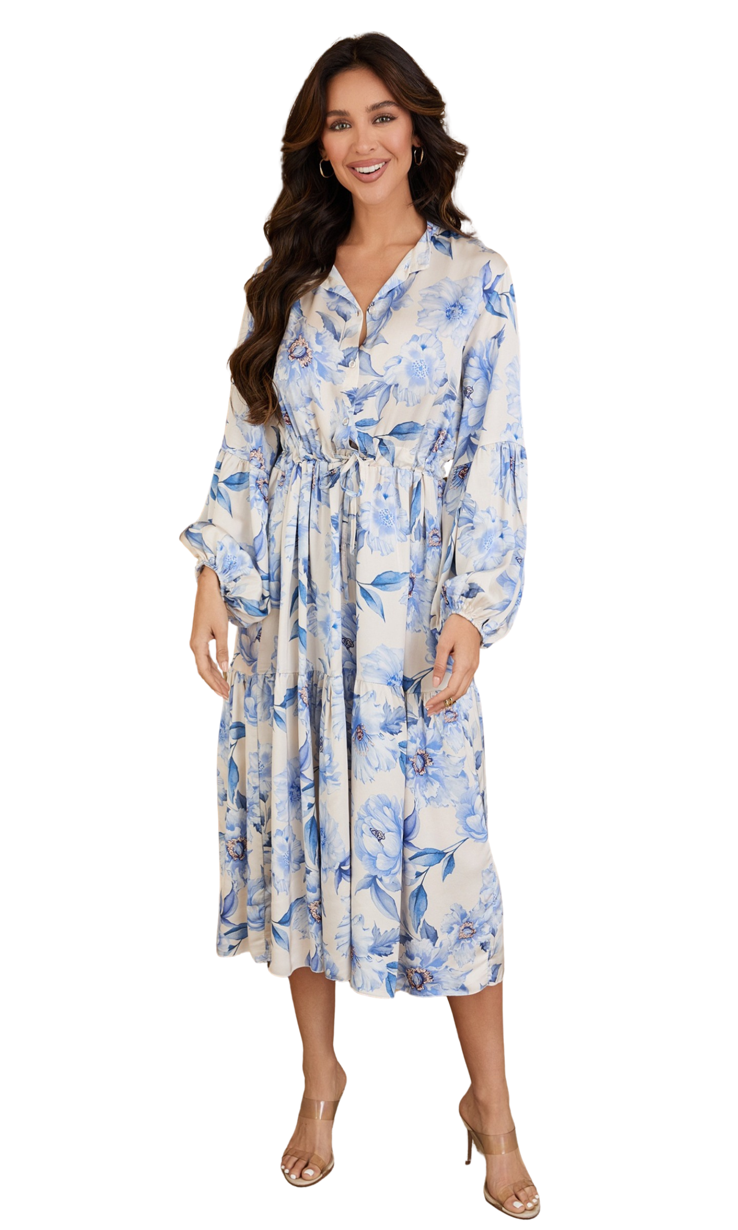 Blue Rose Floral Button Down Tiered Tie-Waist Midi Dress