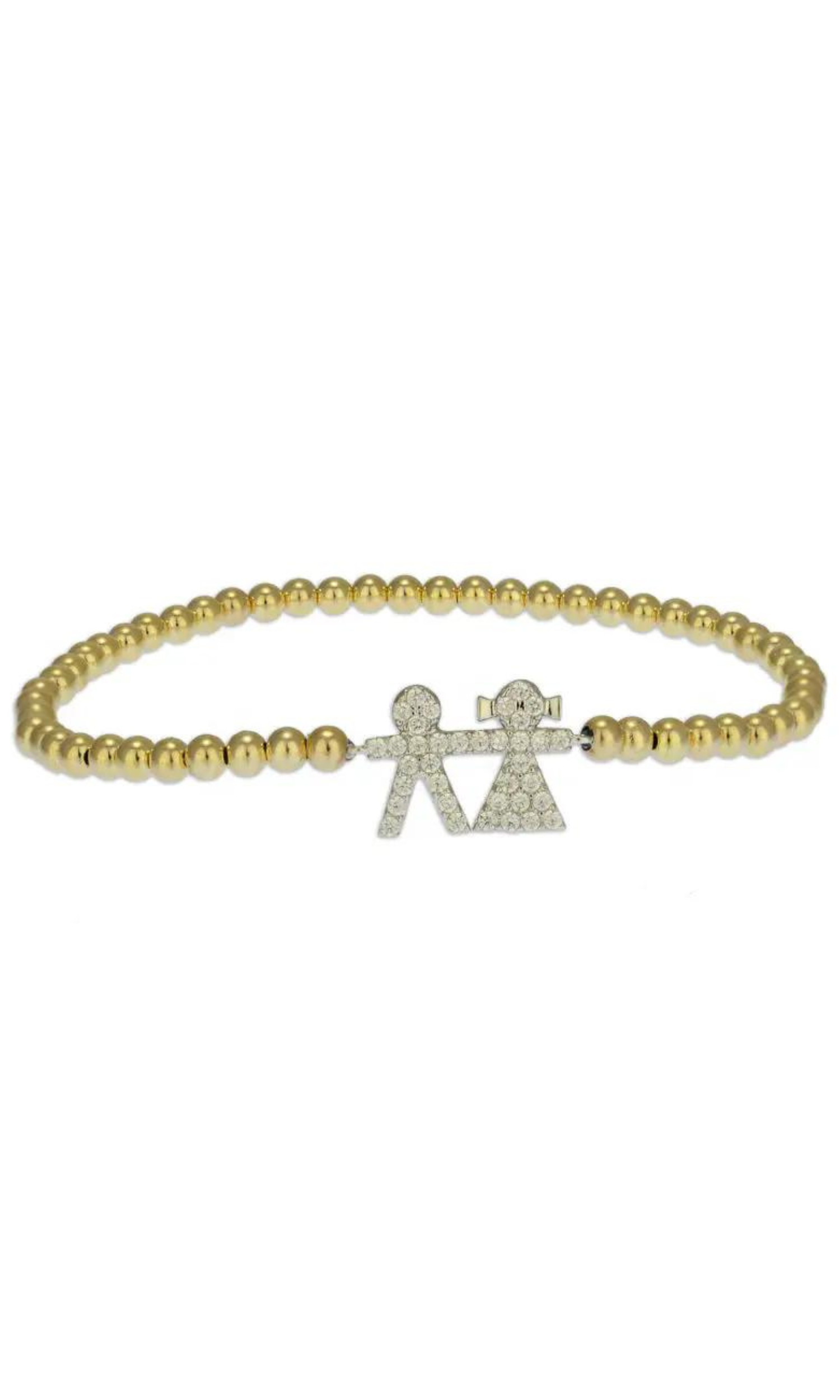 This simple beaded bracelet is perfect for adding a dainty accessory to your wrist. This bracelet features a boy and a girl pendant with cubic zirconia crystals in between gold beads. Wear it alone or stack it with our bracelets for the perfect arm party.