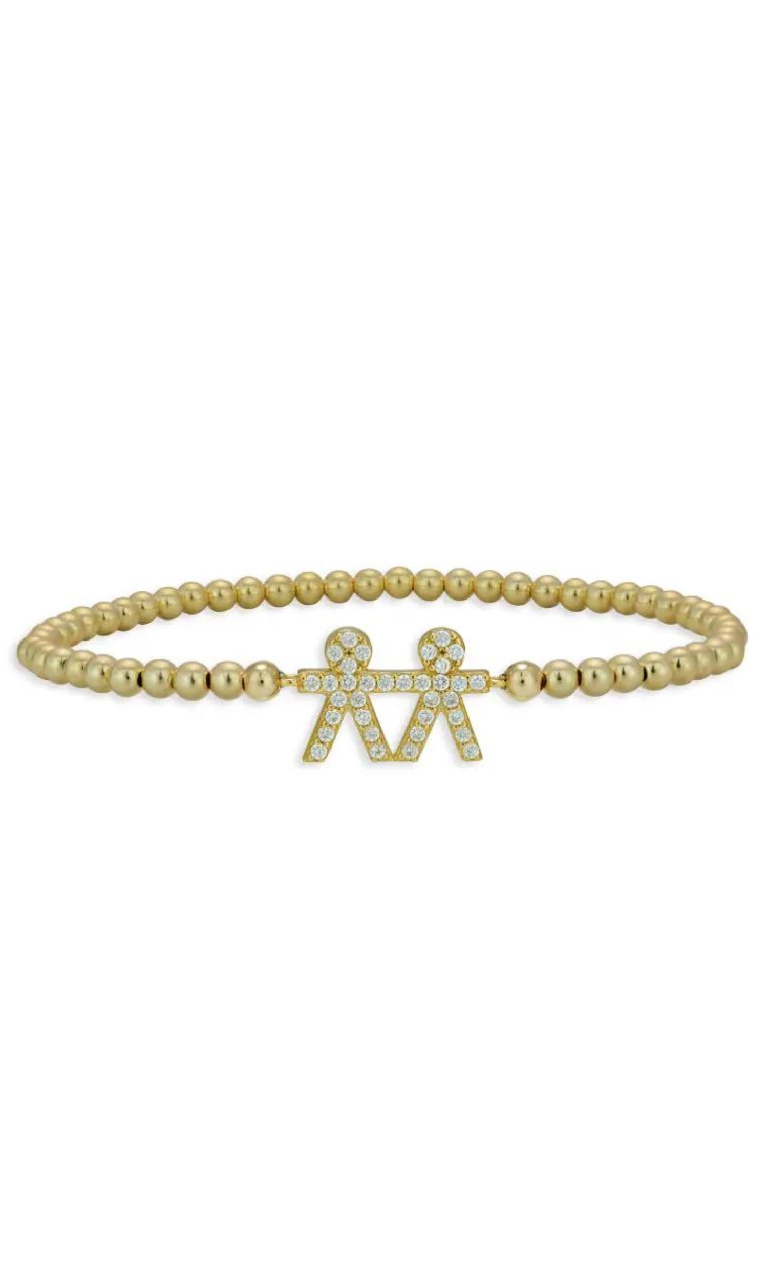This simple beaded bracelet is perfect for adding a dainty accessory to your wrist. This bracelet features two boy pendants with cubic zirconia crystals in between gold beads. Wear it alone or stack it with our bracelets for the perfect arm party.