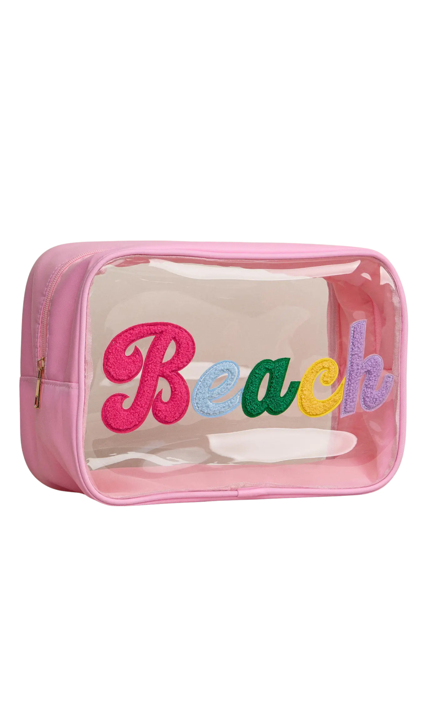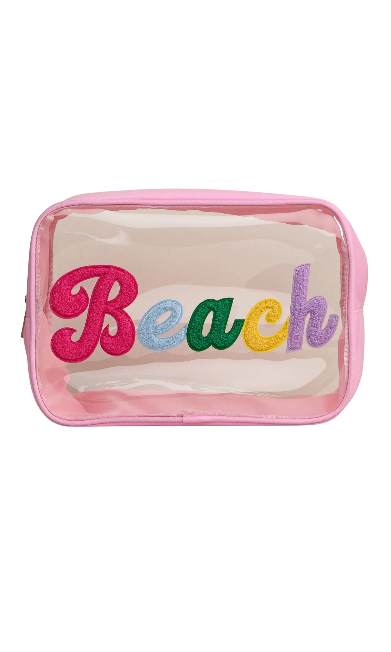 Stay organized in style with these clear travel pouches featuring bold chenille word patches like Beach. Designed with a spacious interior and zip closure, they’re perfect for stashing sunscreen, swimsuits, cosmetics, or travel essentials. The see-through design makes it easy to find what you need, while the playful multicolor lettering adds a fun summer vibe.