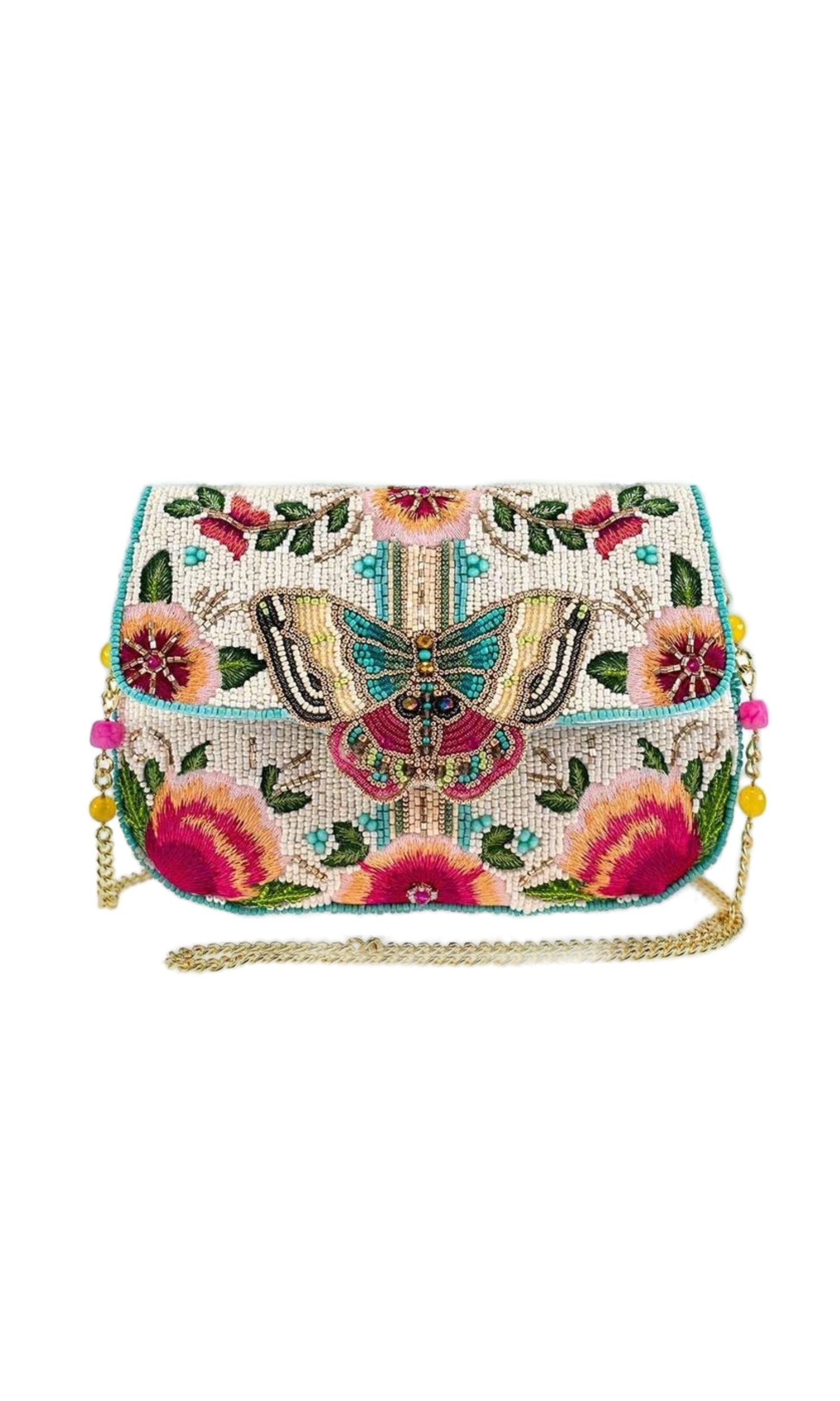 Elevate your outfit effortlessly with our Butterfly Beaded Crossbody Handbag, featuring intricate beadwork in a captivating butterfly motif and a luxurious gold chain for timeless elegance and functionality.