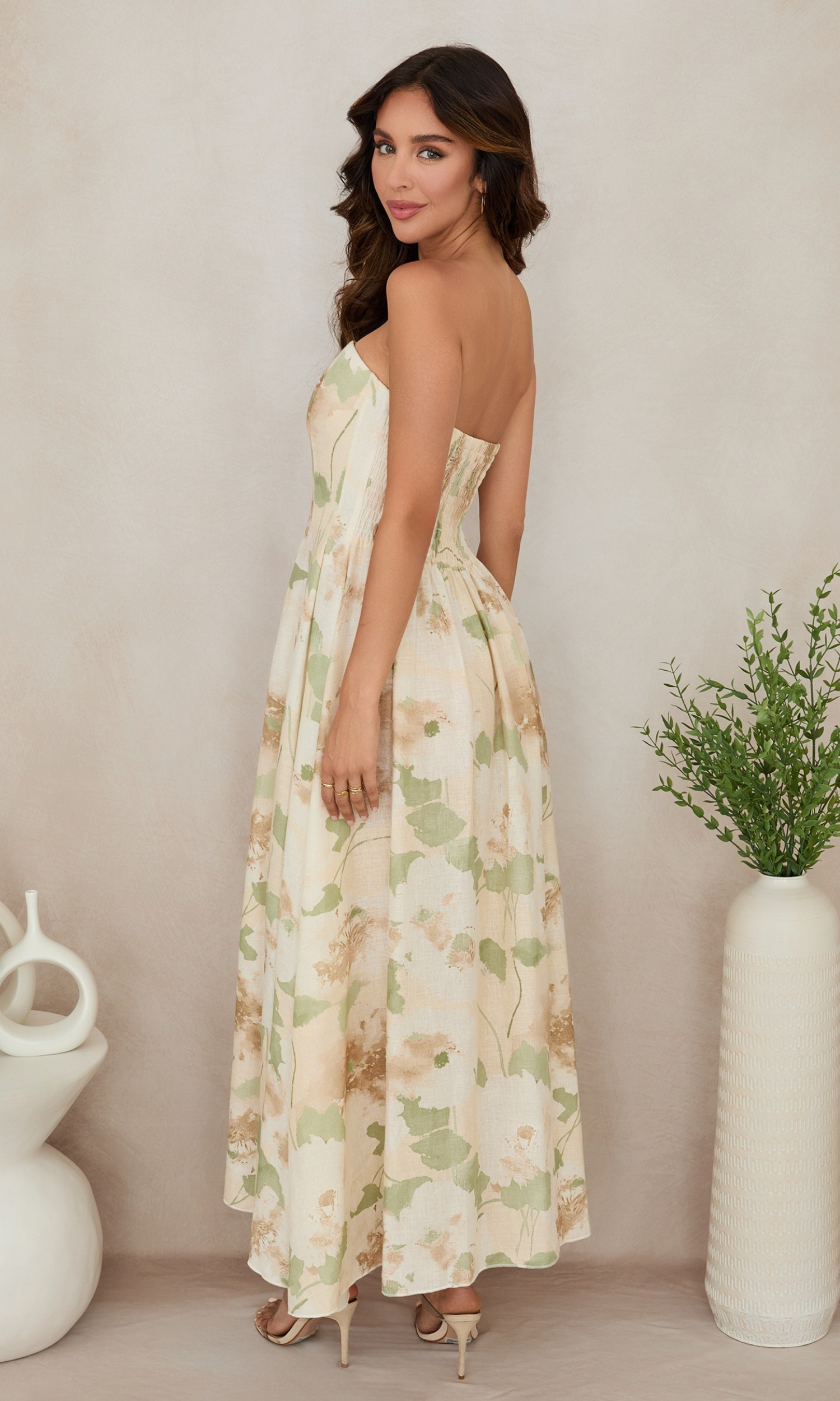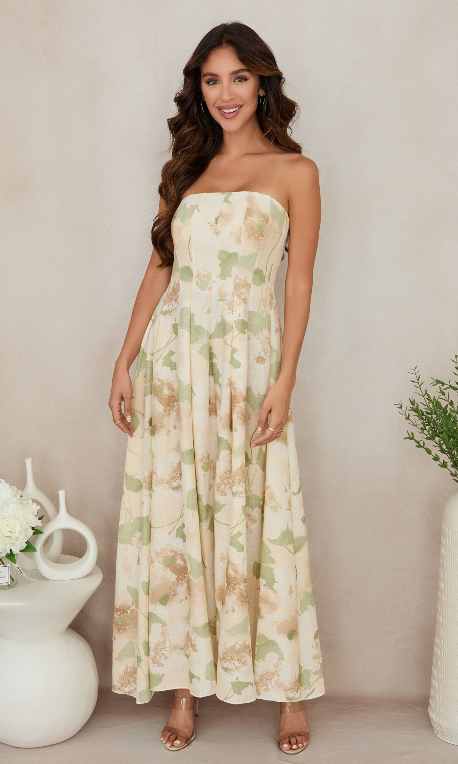 Elevate your style with this classic and sophisticated Strapless Positano Floral Meadow Maxi Dress. Turn heads while you're running errands or vacationing! The floral detail and pleats on the waist add the perfect element of chic elegance.