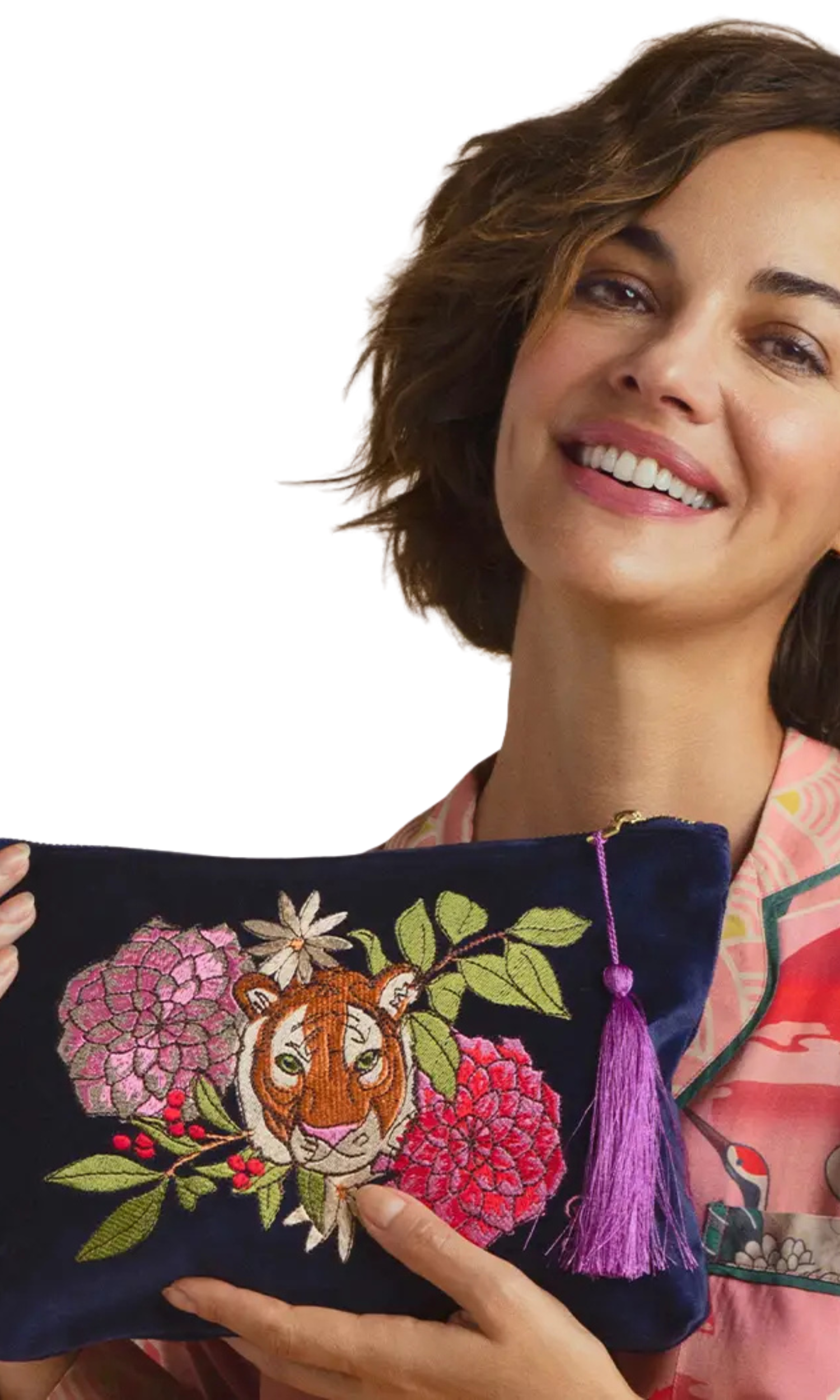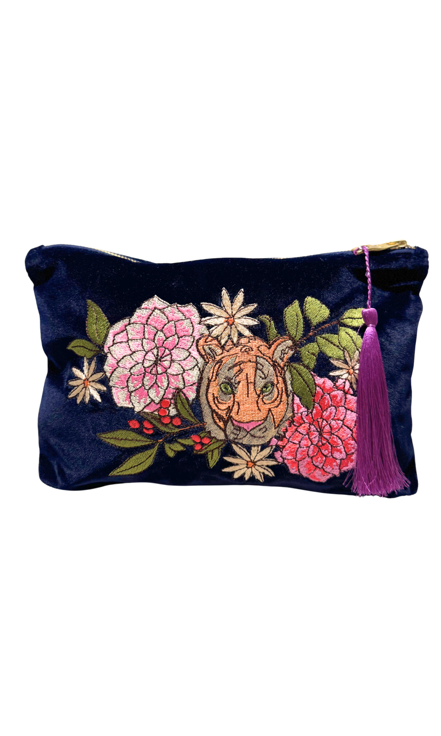 Our Floral Tiger Everyday Pouch will keep you organized snd stylish every day. It's perfect to throw in cosmetics, tech essentials or your favorite jewelry pieces. Colorful threads and a velvet base, this pouch is elegant and stylish.