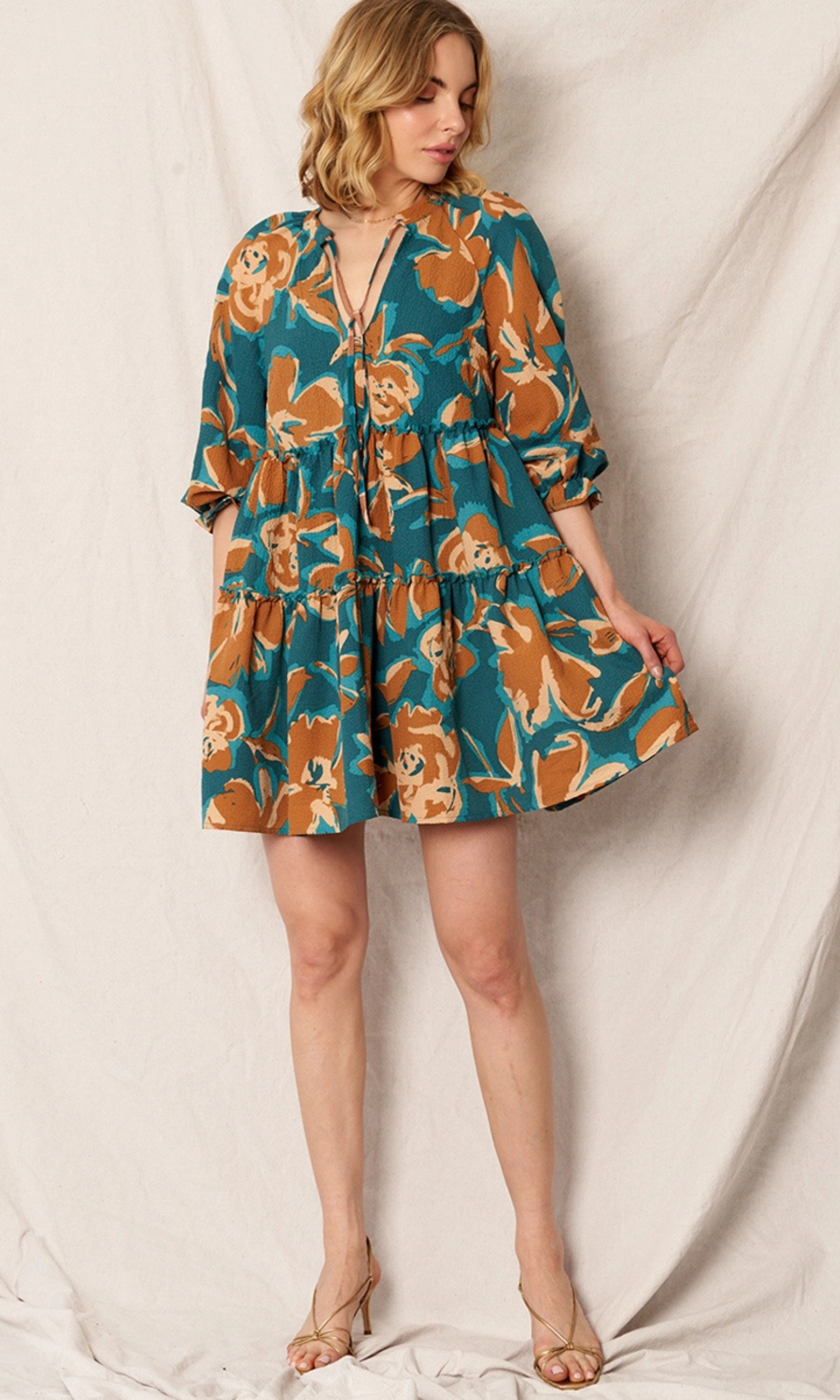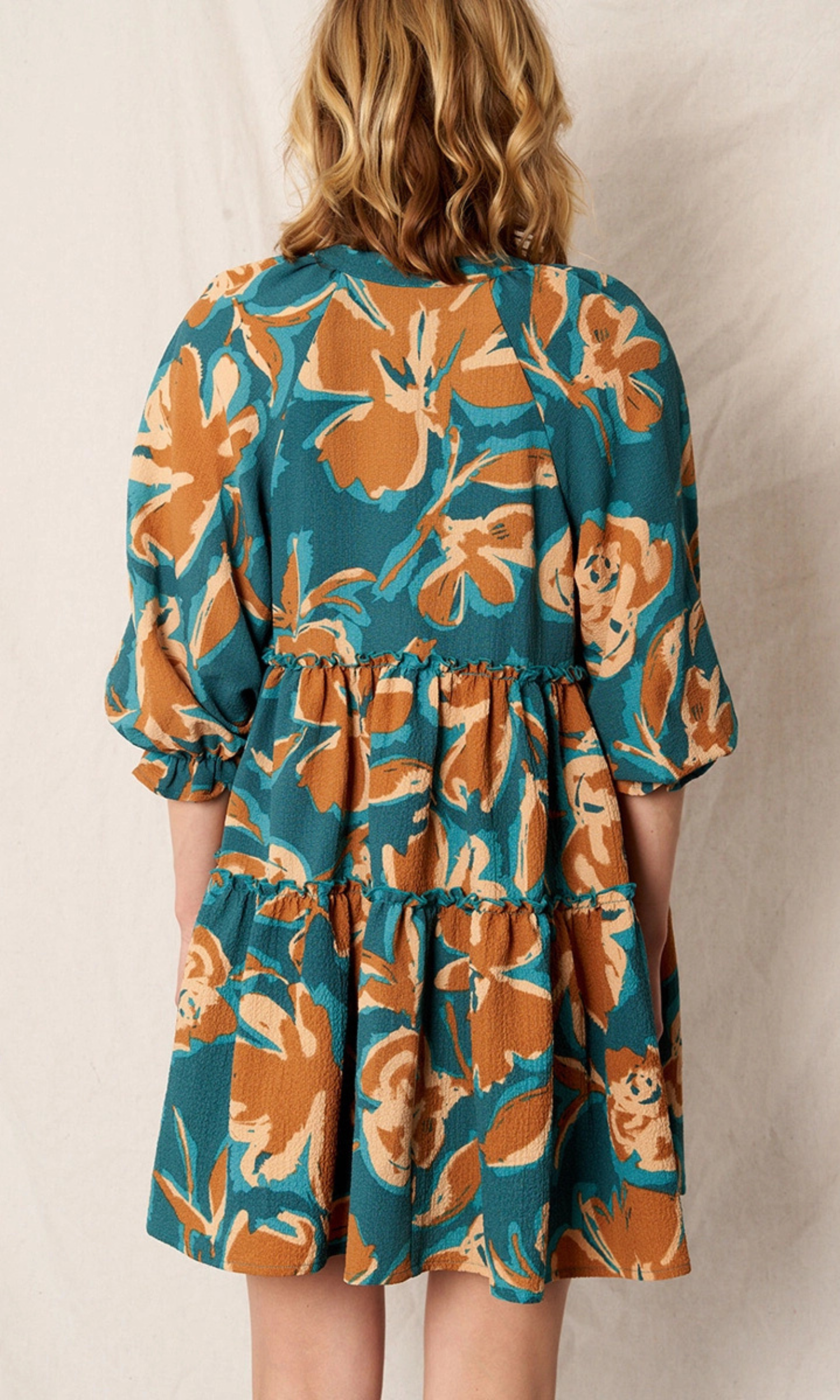 Elevate your look with this elegant mini dress. The puffy sleeves, brown and turquoise pattern, and flowy skirt is perfect for a day time or night time event. Dress it up with heels or down with sandals or sneakers for an effortless look.