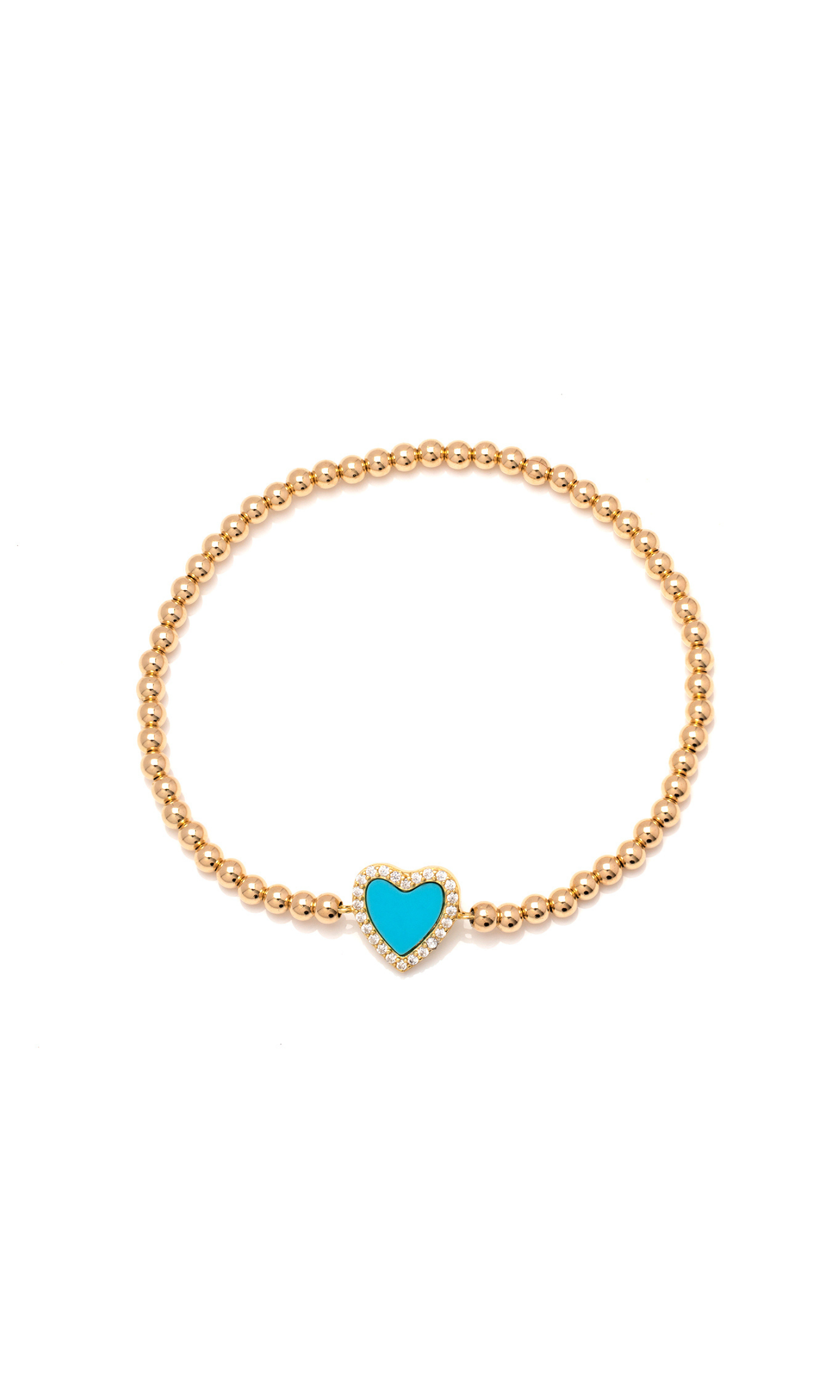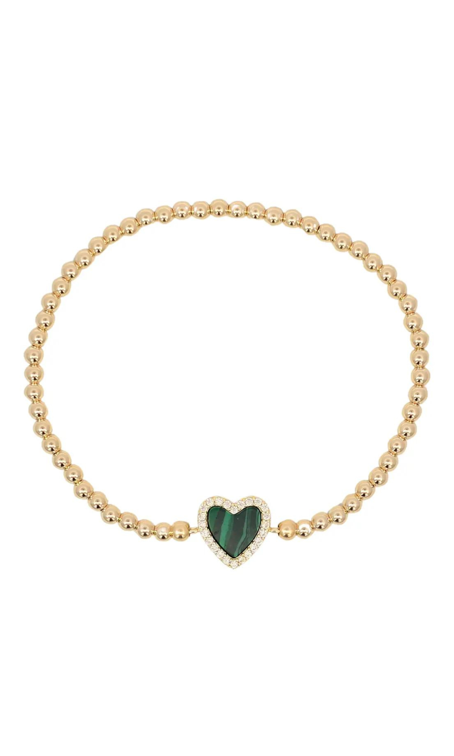 This simple heart beaded bracelet is perfect for adding a dainty accessory to your wrist. This bracelet features a heart pendant in colors green or turquoise decorated with cubic zirconia crystals and surrounded by gold beads. Wear it alone or stack it with our bracelets for the perfect arm party.