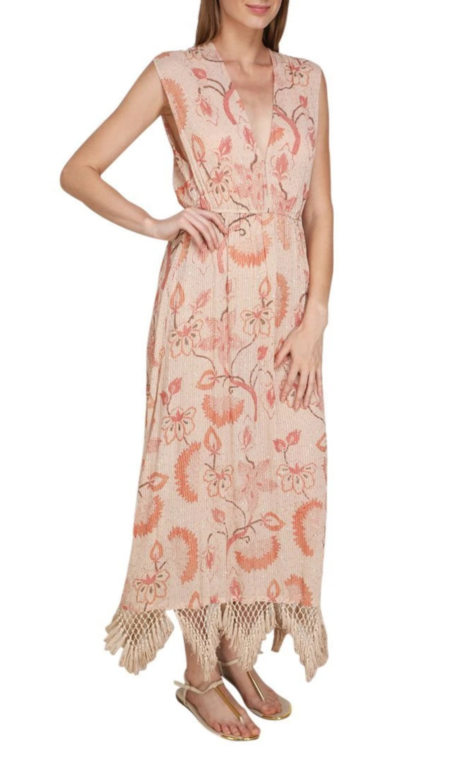 Elevate your look with this elegant Bella maxi dress. It shimmers in the light, has tassels on the bottom that flow, and an elegant v-neck design that's chic! Cinch it at the waist for a perfect for a day time or night time event.
