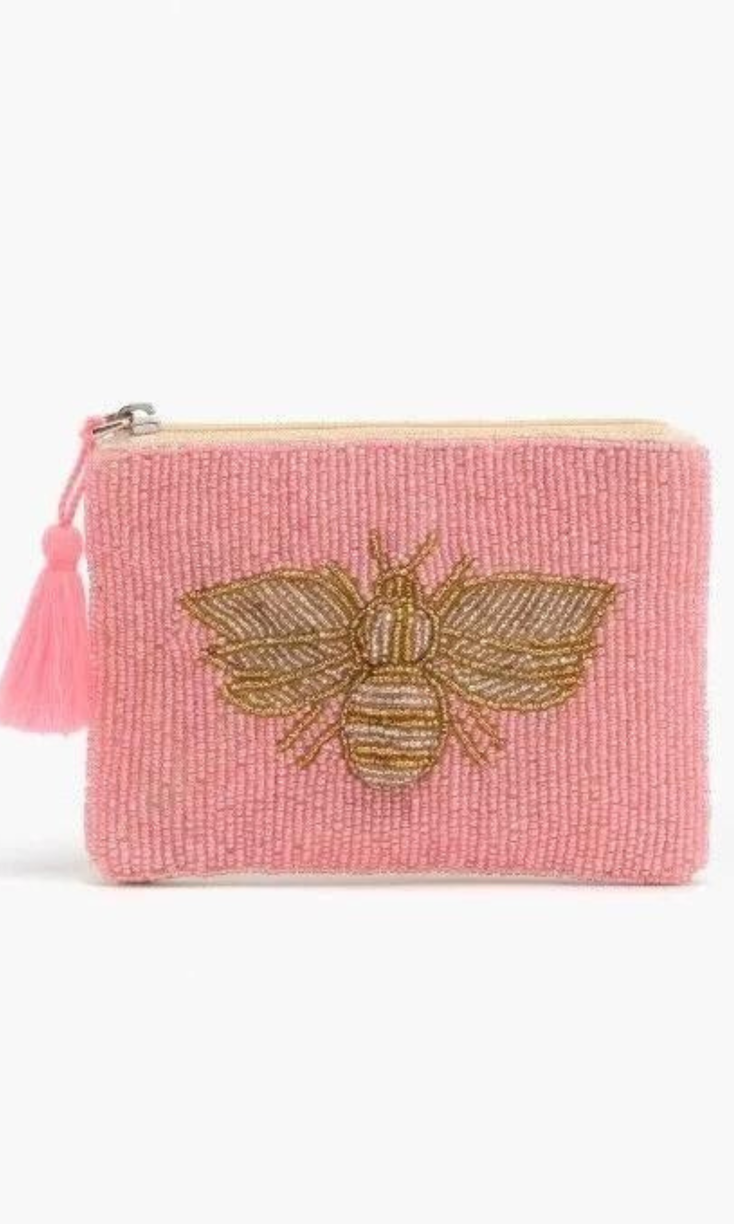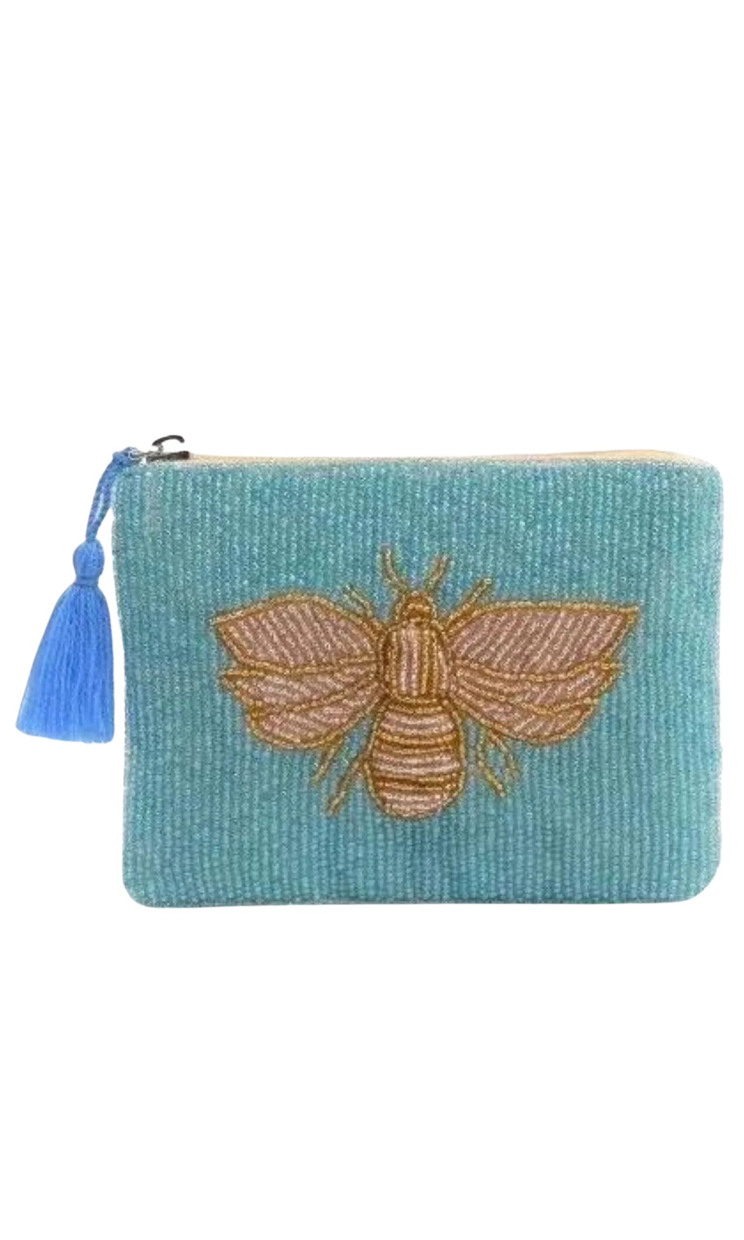 This stunning beaded bag features a bee that will radiate glamour throughout your day! Hand beaded by artisans in India, this versatile bag features a tassel on the zipper pull. It's perfect for small essentials thrown into a purse on the go.