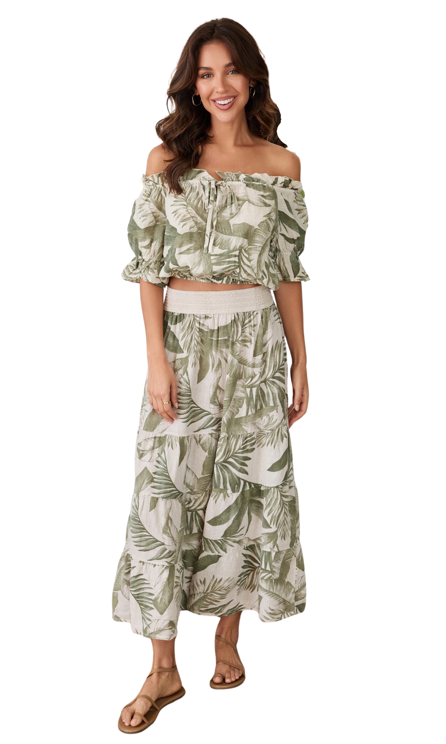 Palmaria print crop off shoulder linen top. Lounge in style this summer with our Palmaria print crop off shoulder linen top! Made from high-quality linen and featuring a beautiful hawaiian print, this top is perfect for beach days or casual outings. The off-shoulder design adds a touch of elegance, while the crop length keeps you feeling cool and comfortable. Get yours today and elevate your summer wardrobe!