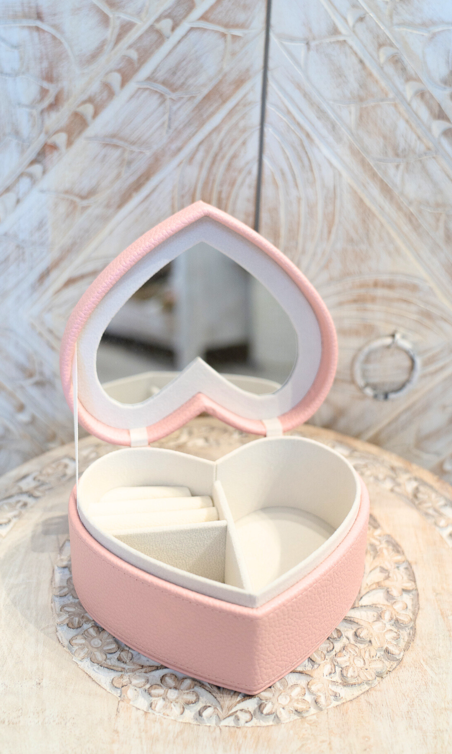 The Heart Jewelry Box offers sustainable storage for those who travel often or want a new box to organize their jewelry in. The box has a snap closure, heart mirror inside, a place for rings, and then two separate compartments.