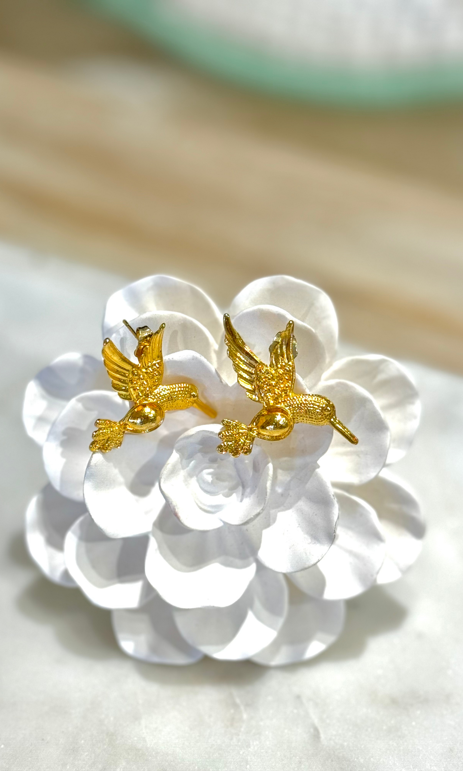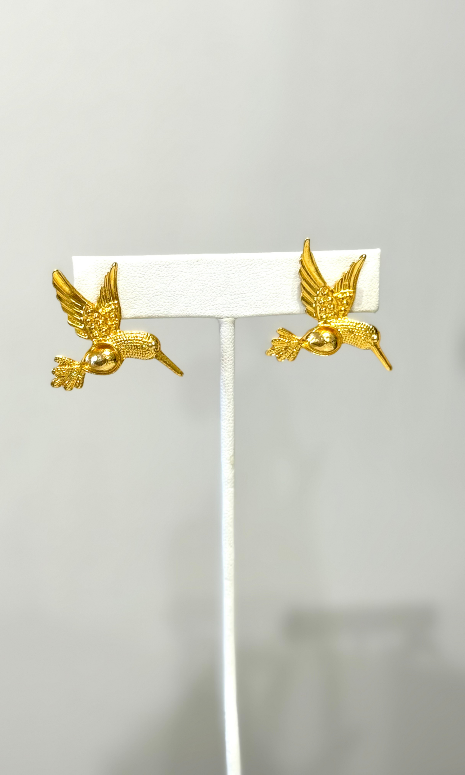 Treat yourself to these stunning studs. This intricate design includes a shimmering gold hummingbird. These birds are made with intricate details, making this piece unique and captivating. They'll be the perfect statement to your daily or evening look.