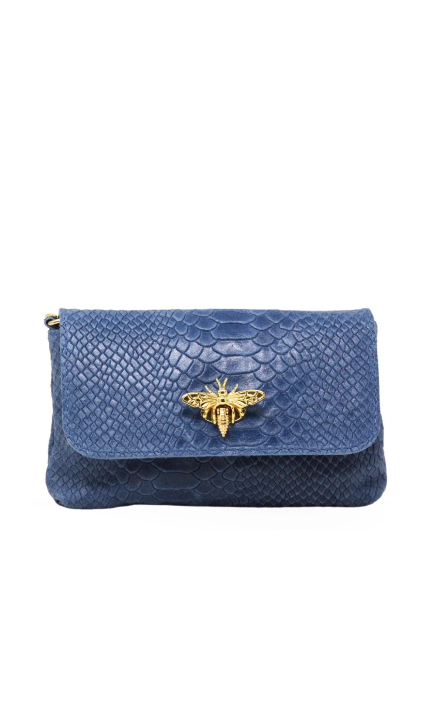 This handbag is a versatile leather piece imported from Italy that can be used as a clutch, wristlet, or crossbody. It features a a bee clasp, and three different handle options. This purse is made out of a high-quality, delicate textured leather. This accessory isn't just a bag; it's a statement that carries elegance with you.