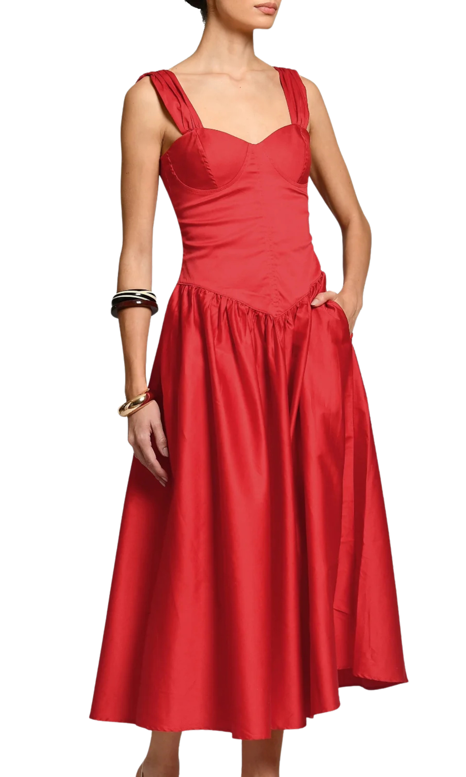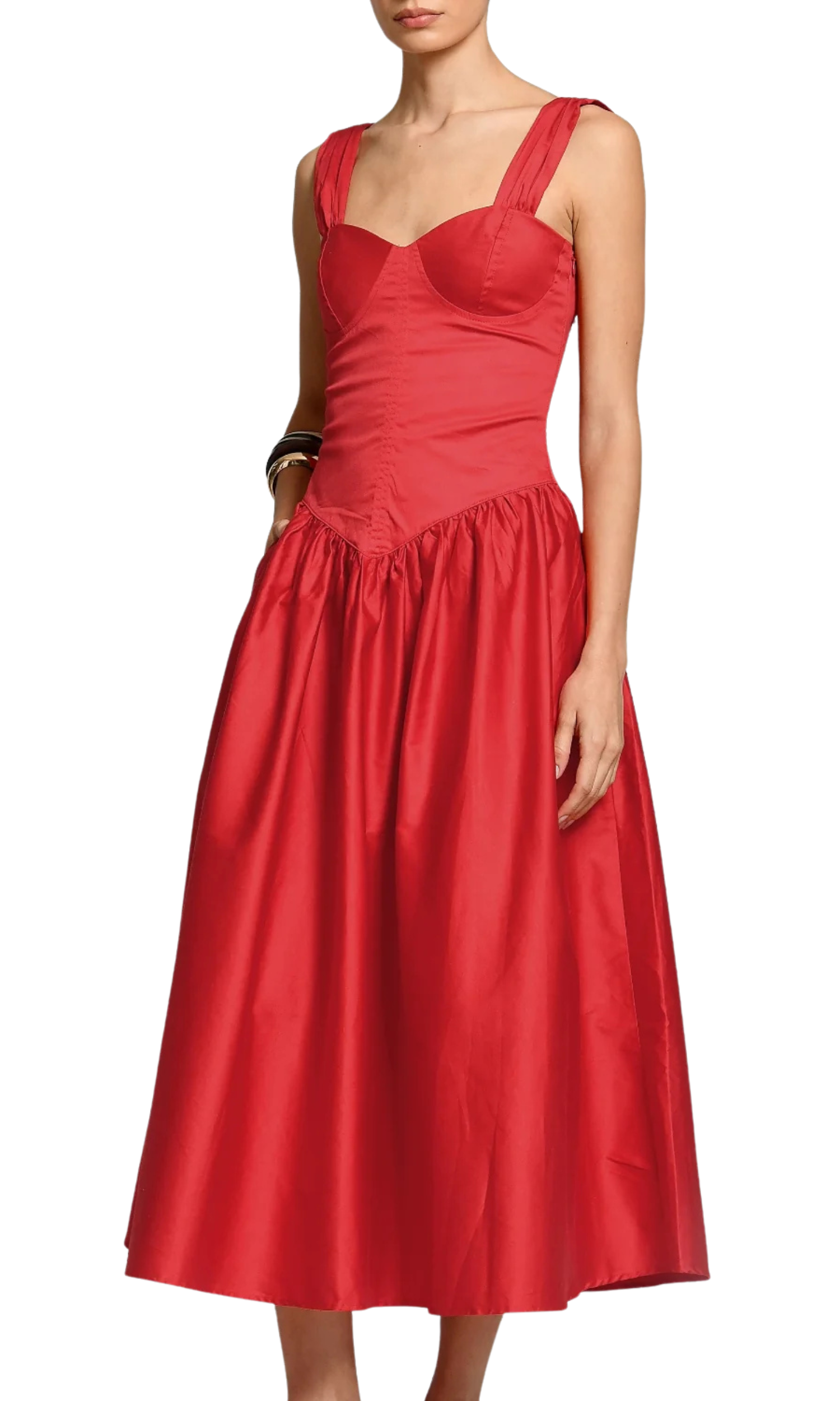 Elevate your look with this elegant Je'taime Red Midi Dress. The corset like top and adjustable waist line, and flowy skirt is perfect for a day time or night time event. Dress it up with heels or down with sandals or sneakers for an effortless look.