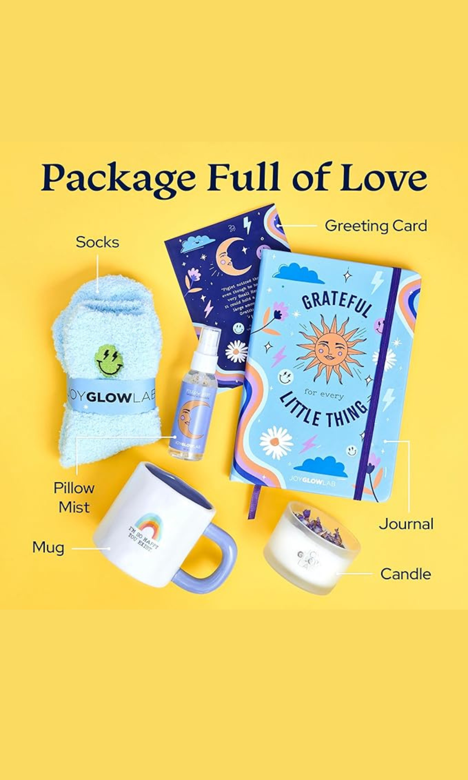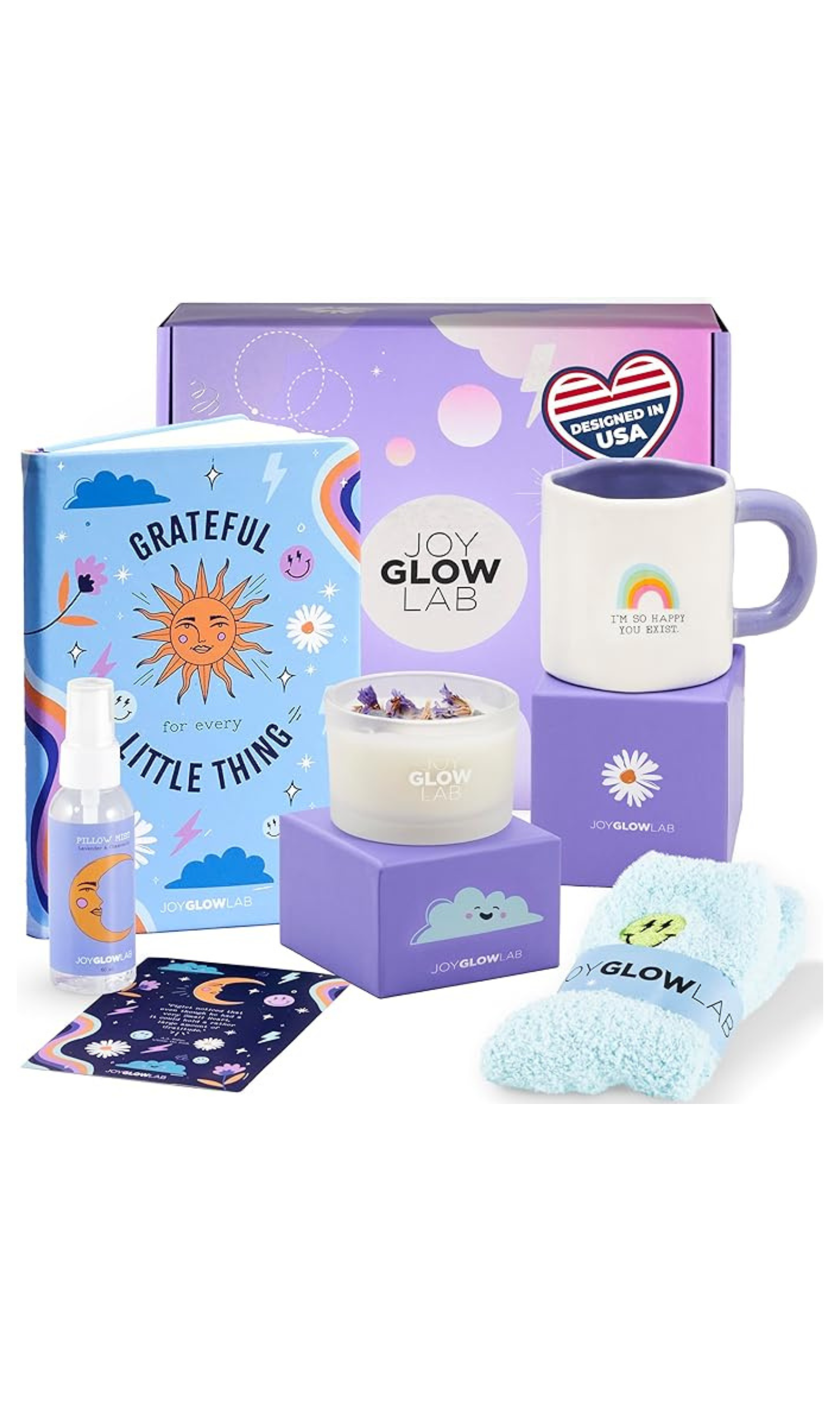 Our 6-item lavender-themed self-care gift set for women includes organic soy candle, a beautiful uplifting cup, a gratitude journal for reflection, a calming lavender & chamomile pillow mist for restful sleep, cozy socks, and an inspirational greeting card. It's ideal as an appreciation gift for women to express gratitude and care. Perfect for teen girls, college students, and friends, this thoughtful encouragement gift reminds her how loved and valued she truly is—whether she’s near or far.