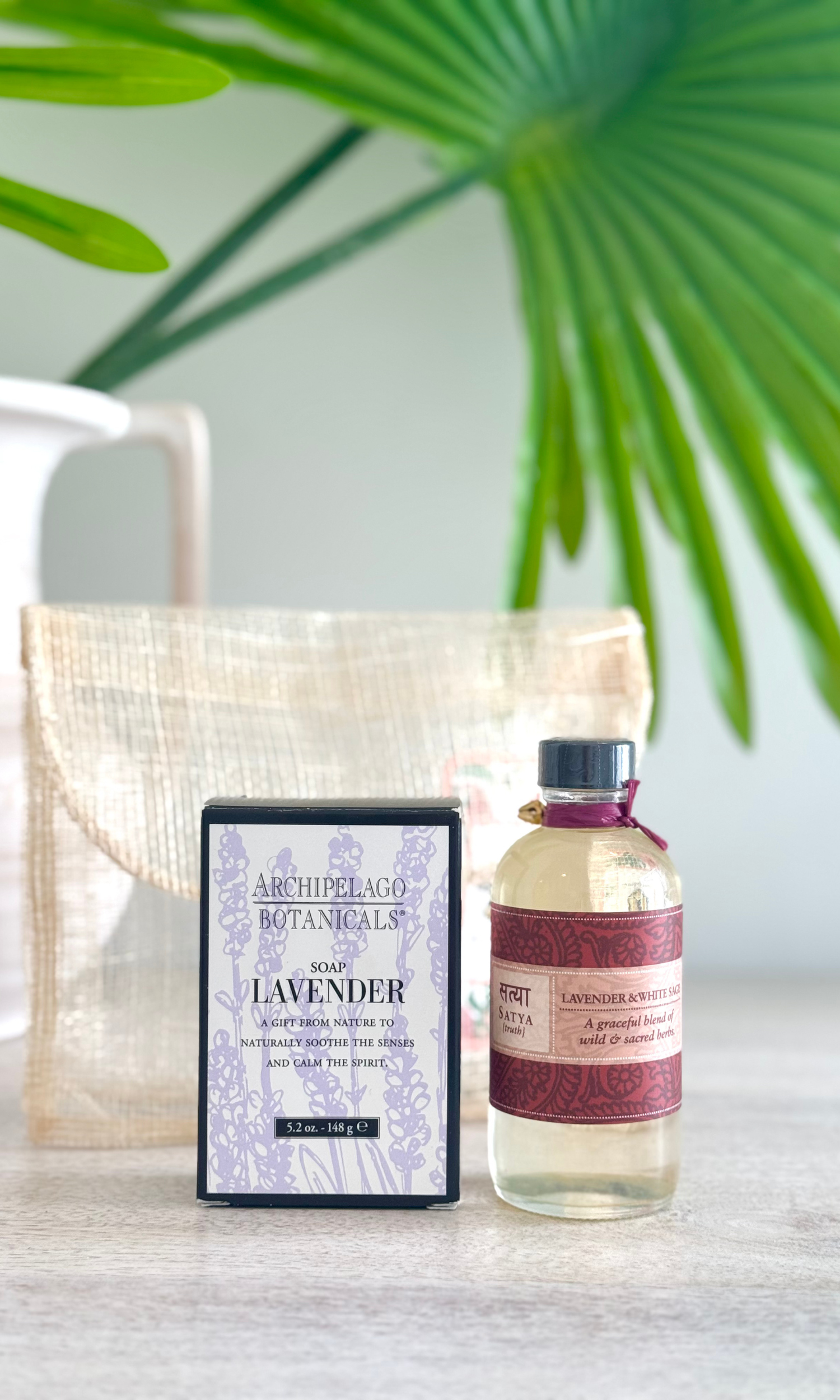 Revitalize your skin and unwind your senses with our Lavender Body Set. This includes a lovely raffia pouch, perfect for gifting. Enjoy an oil infused with lavender and white sage, as well as a lavender soap that naturally soothes the senses and calms the spirit.