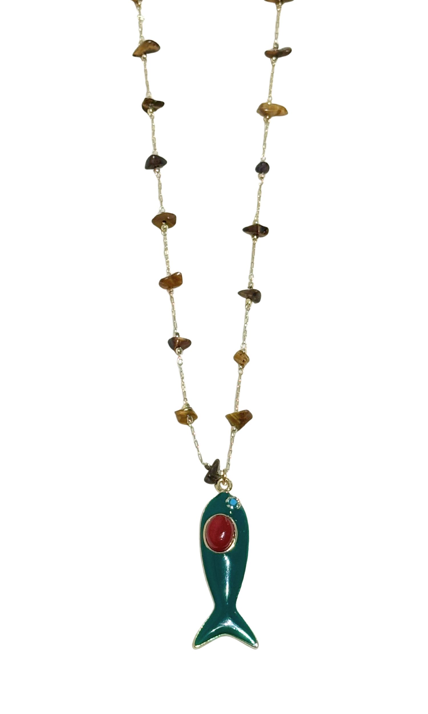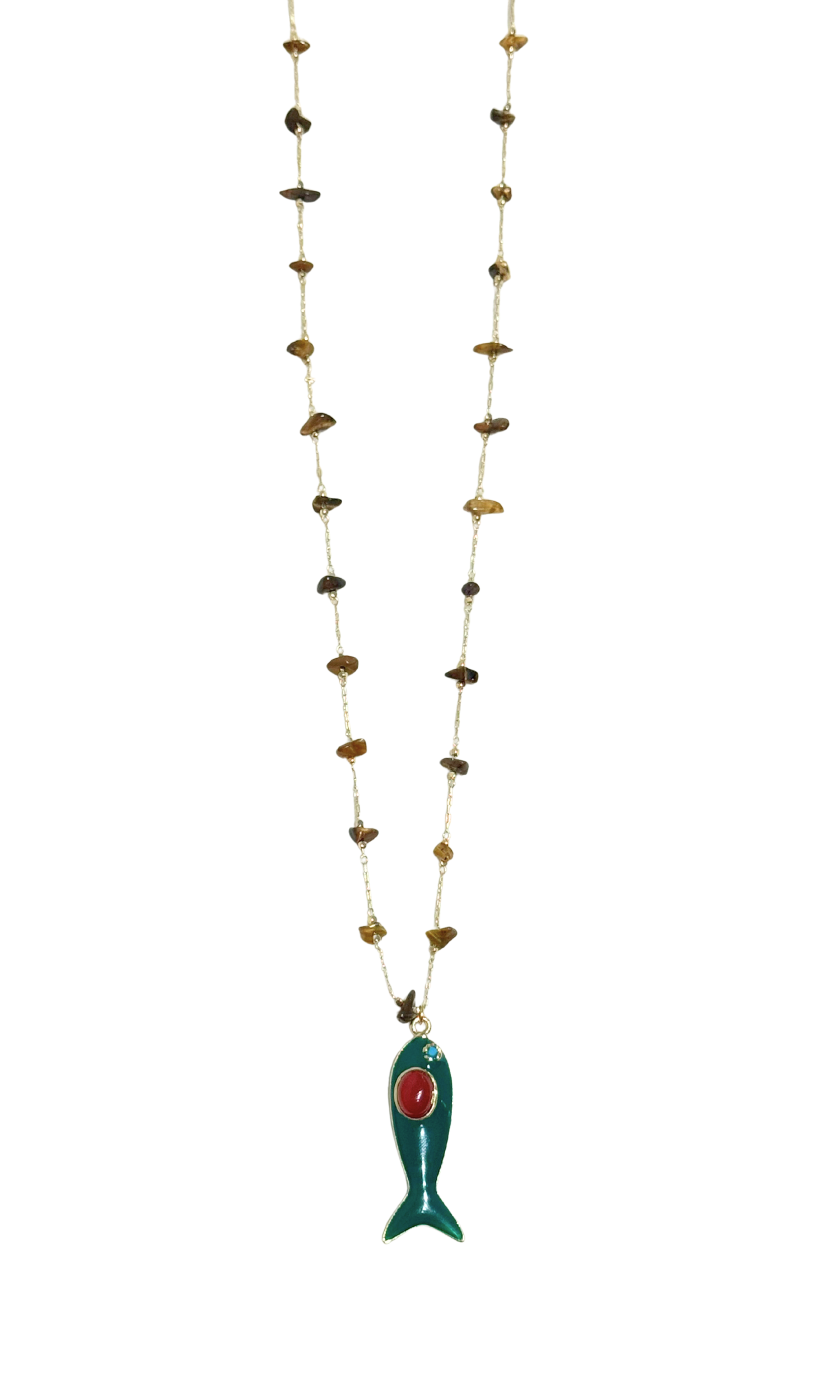 Treat yourself to this delicate necklace made out of semiprecious stones and features a green ceramic sardine fish. And the best part? Wear it long or layer it by adjusting it around your neck. Layer it with other dainty jewelry or wear it on its own to make your outfit pop.
