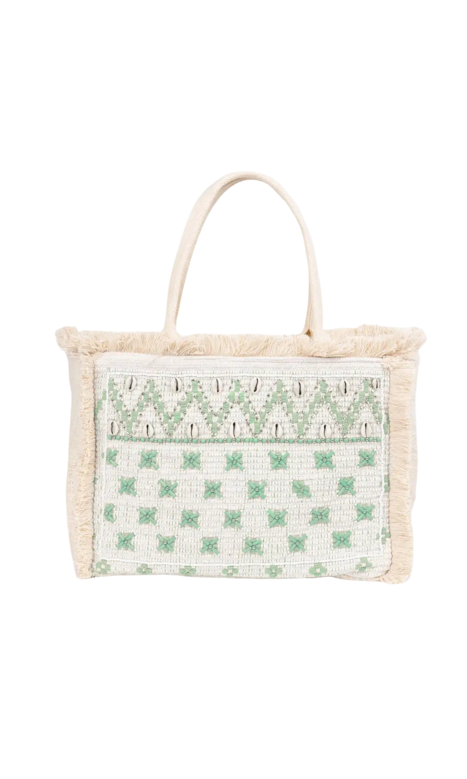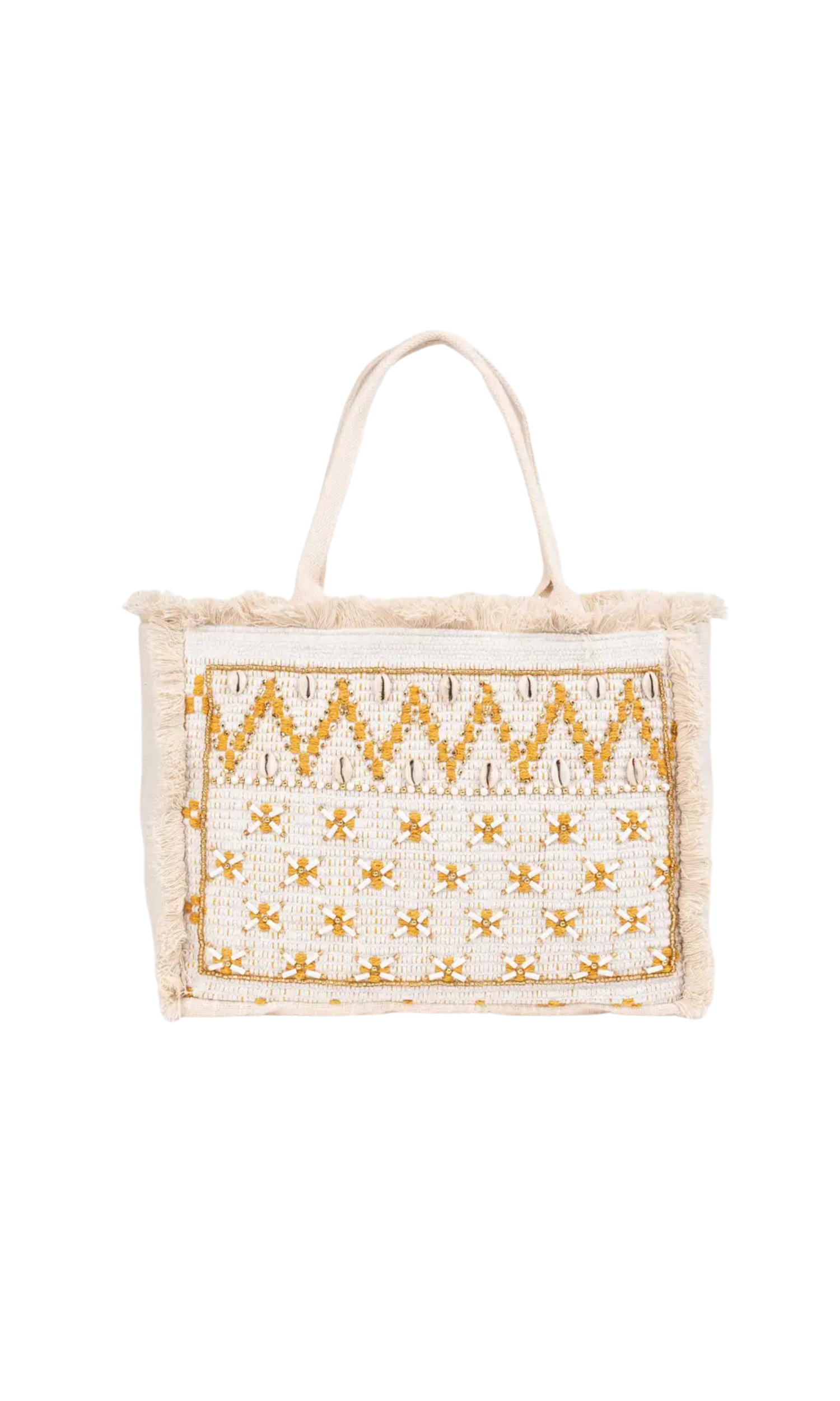 This viscose tote bag is a fresh and summery choice, ideal for everyday wear or a day at the beach. Its design features vibrant yellow tones that bring joy and luminosity, while the beads and shells add a bohemian and attractive touch. The fringes at the ends provide a dynamic and fun detail, complementing your style. Spacious and comfortable, this bag is perfect for carrying all the essentials, making it a versatile and chic accessory for your summer adventures.