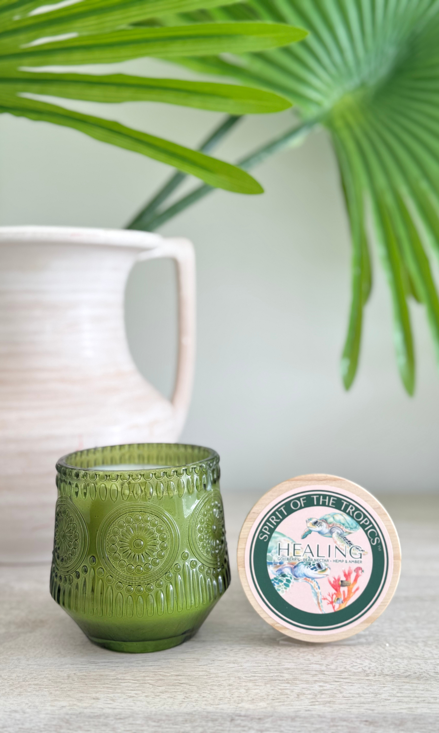 Featuring our Healing Organic Glass Jar Candle with exotic blends of goji berry, pear nectar, and hemp & amber this candle brings positive intention to your space.