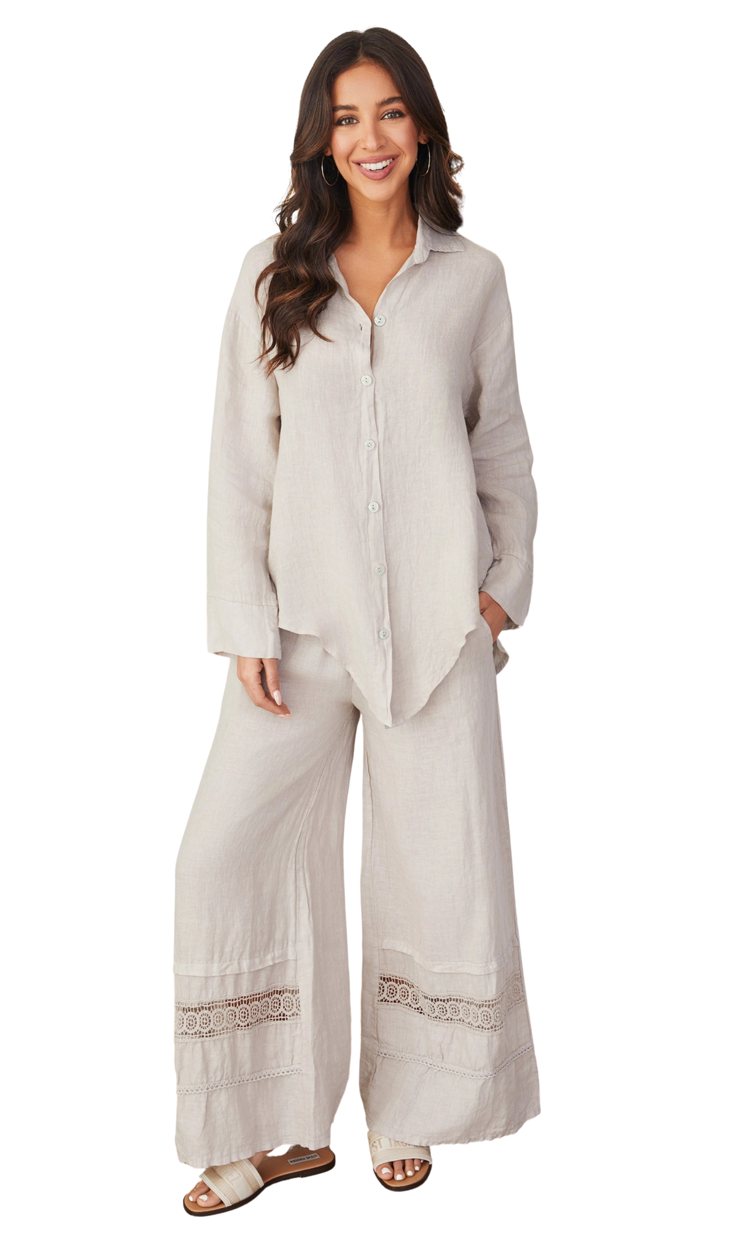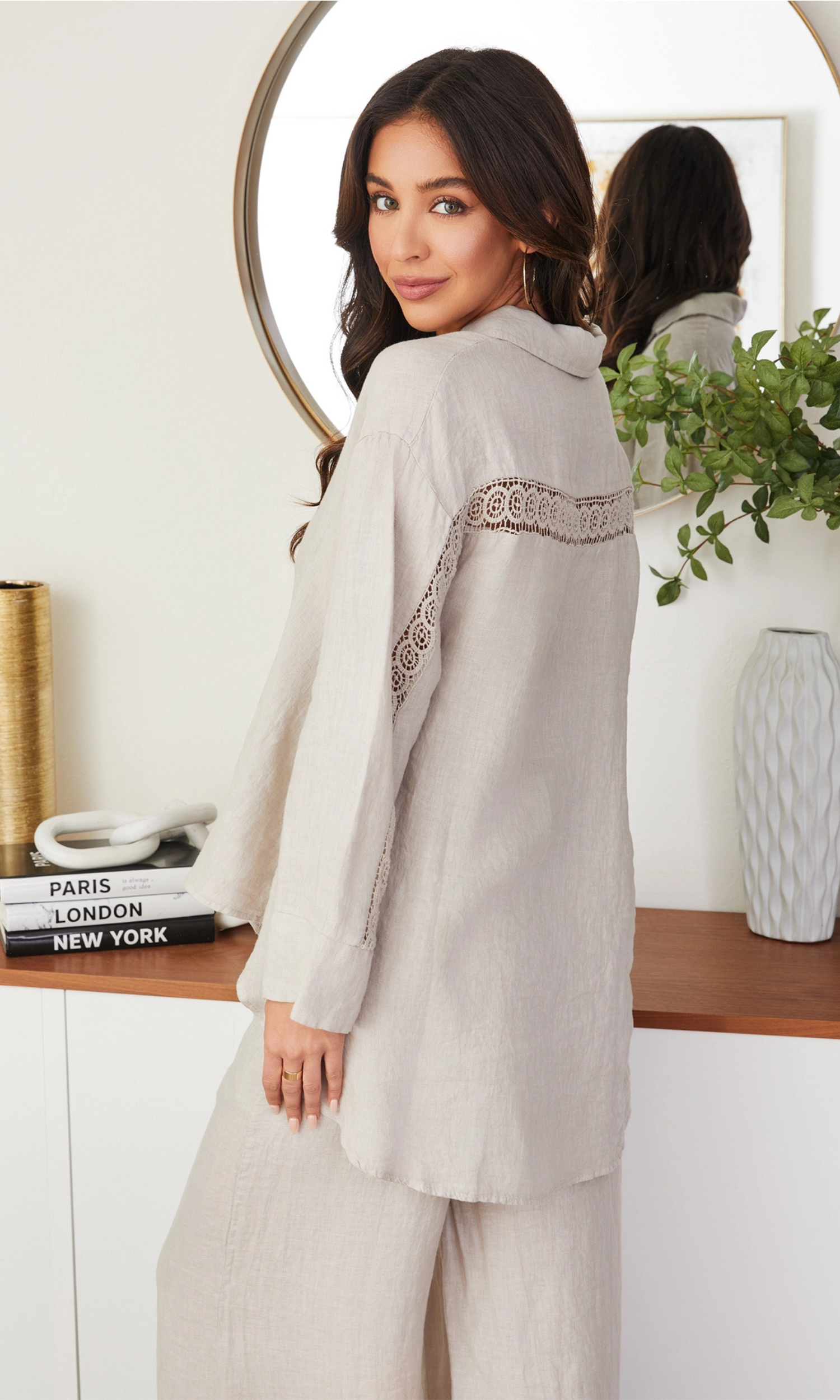 Cala linen button down shirt with embroidery trim. This timeless linen button-down shirt offers classic style with modern detail. Boasting a luxe embroidery trim on the back, this shirt is the perfect balance of classic and fashion-forward. Cut for a comfortable fit, this shirt is perfect for any occasion.