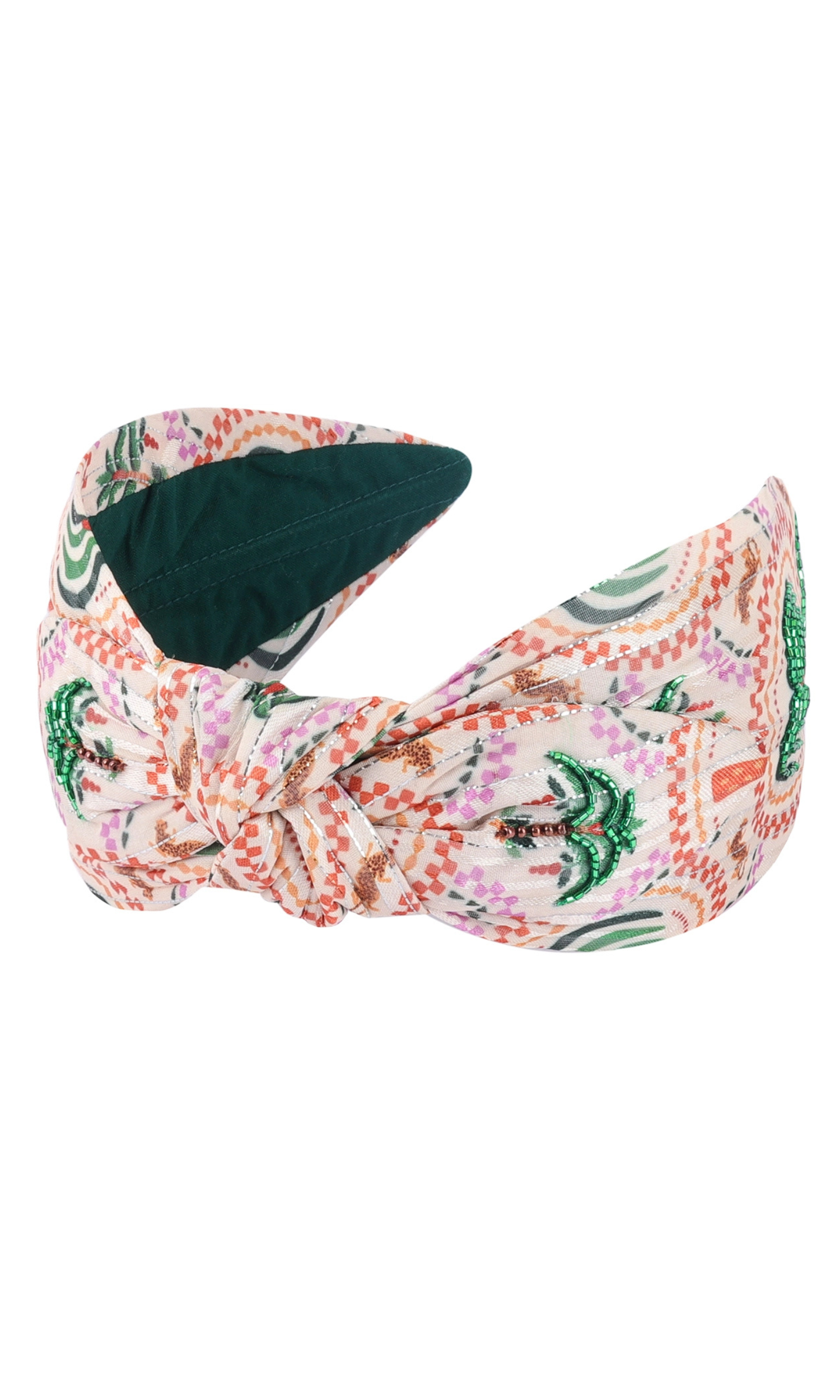 Elevate your style with our hand-beaded headband, showcasing a delicate design made of gems, gold threads and sequins against a refreshing ivory base, exuding timeless elegance and sophistication.