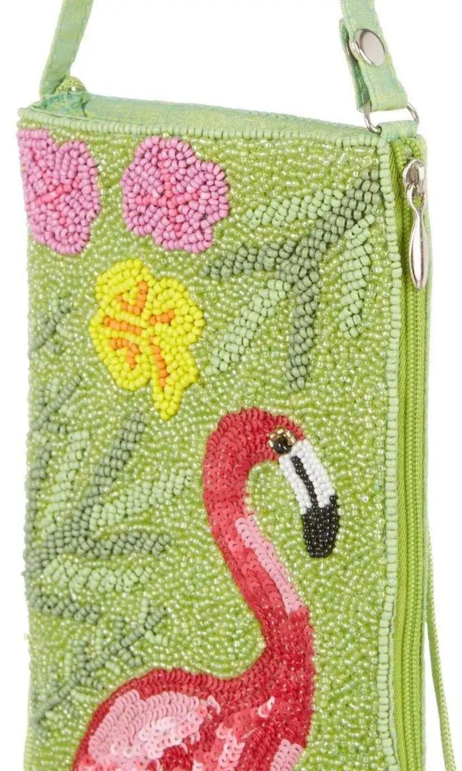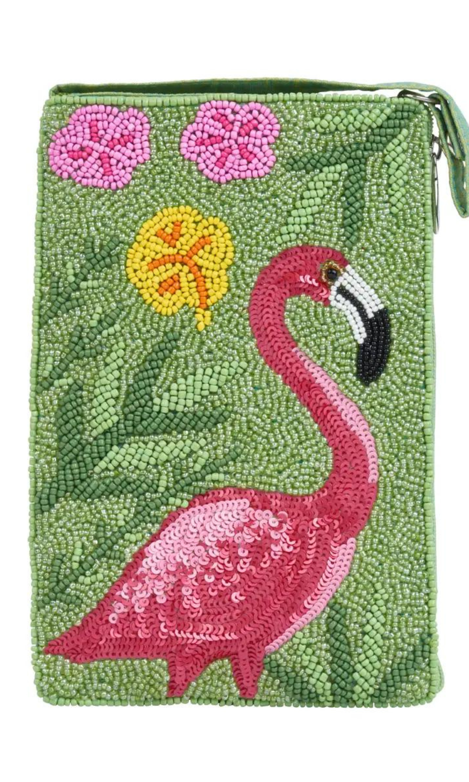 This stunning beaded bag features a flamingo design perfect for adding a touch of glamour to any outfit. Hand beaded by artisans in India, this versatile bag can be used as a crossbody bag, wristlet, or unclipped by the strap to revamp into a purse on the go.