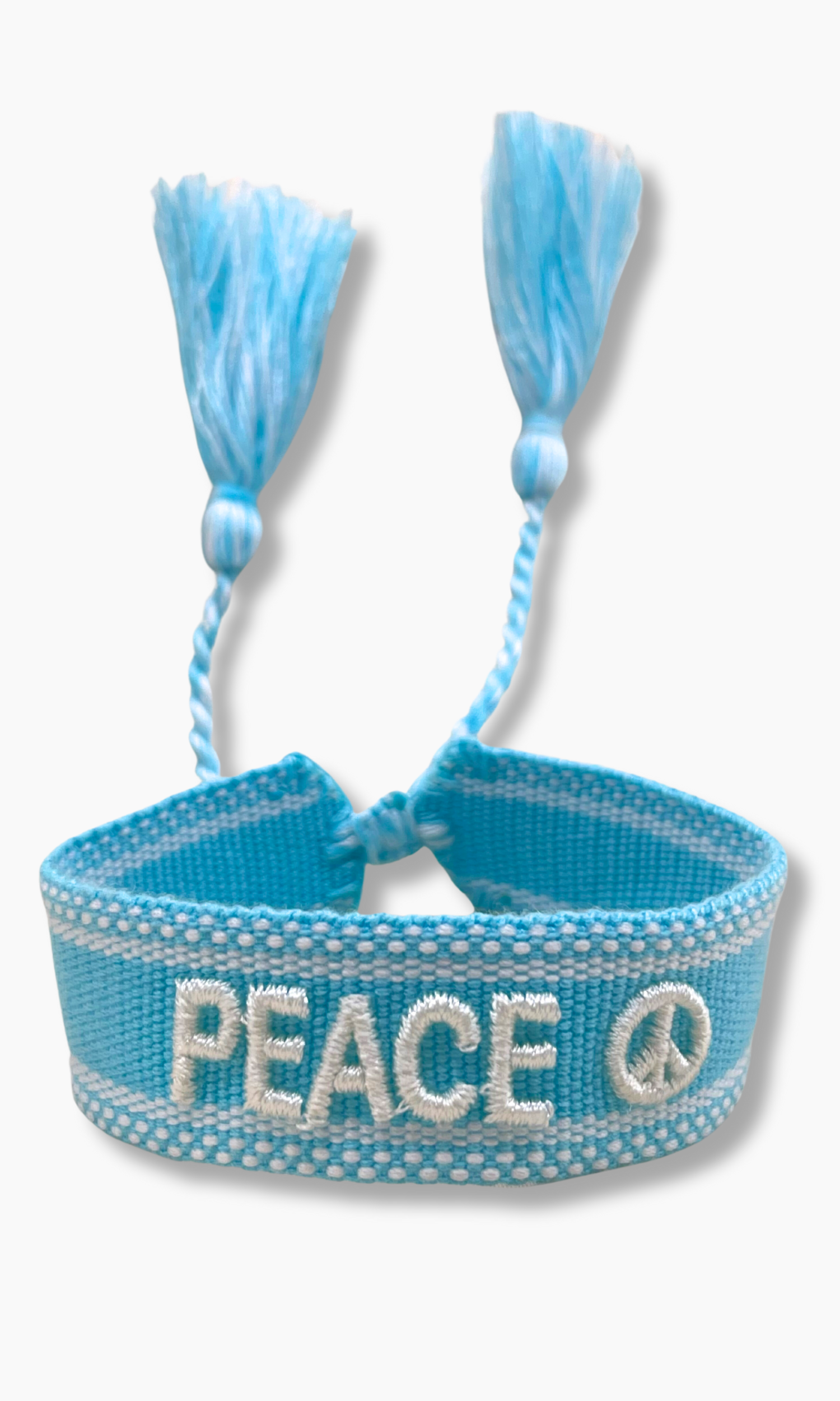 This fabric bracelet features the phrase "Peace" and is a fun way to accessorize your look! The soft blue color and tassels make the perfect gift.