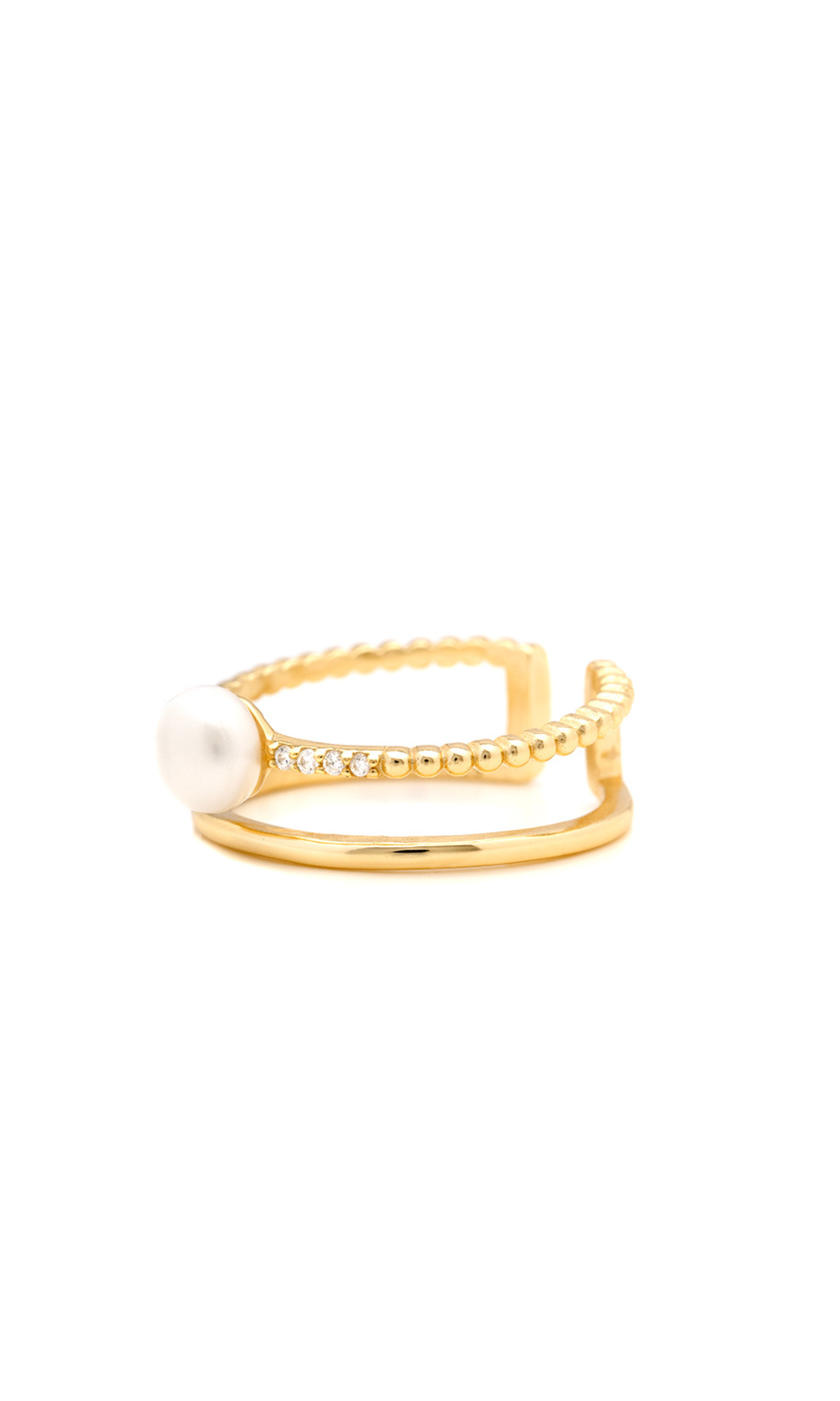 Our Pearl Adjustable Ring is the definition of feminine and elegance. Meant to stand out, this piece is sterling silver plated with 18k gold, featuring a single pearl, cubic zirconia crystals and two bands, creating a stacked affect. This piece is certified nickel free and allergy free.