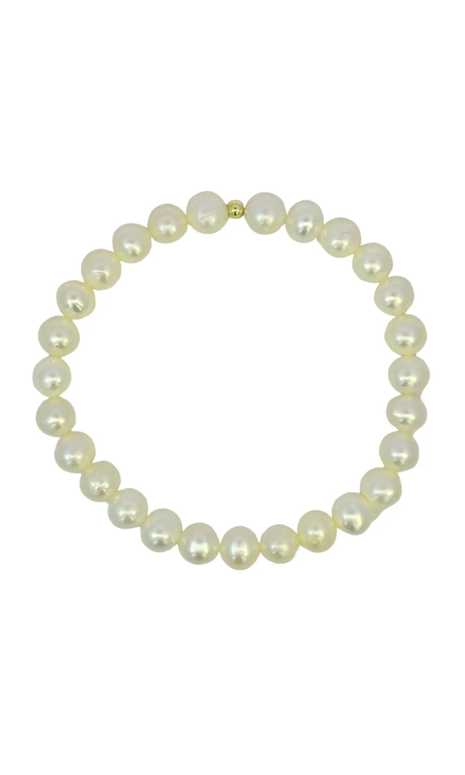 This simple beaded bracelet is perfect for adding a dainty accessory to your wrist. This bracelet features large white pearls and a small gold bead. Wear it alone or stack it with our bracelets for the perfect arm party.