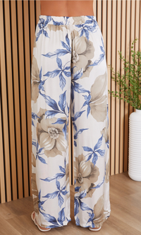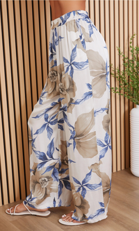 Tuscany floral print wide leg silky pant with pockets. These pants feature a beautiful Tuscany  floral print that will add a touch of elegance and charm to your wardrobe. Designed with a wide leg and silky material, these pants provide a comfortable and flattering fit. Plus, with the addition of pockets, they offer both style and functionality. Perfect for any occasion, these pants are a must-have for any fashion-forward individual looking to elevate their style.