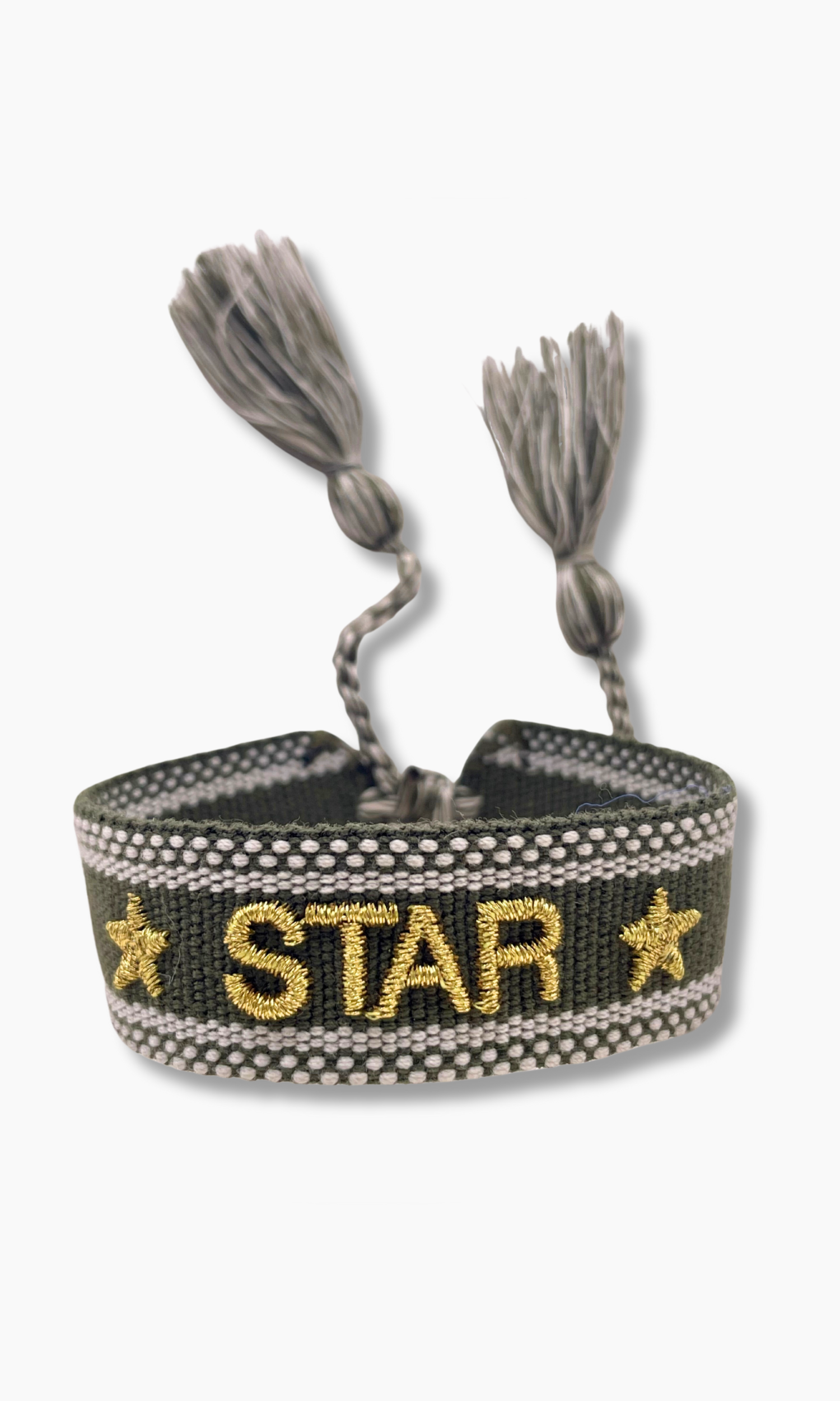 This fabric bracelet features the phrase "Star" and is a fun way to accessorize your look! The soft gray color, gold lettering, and tassels make the perfect gift.