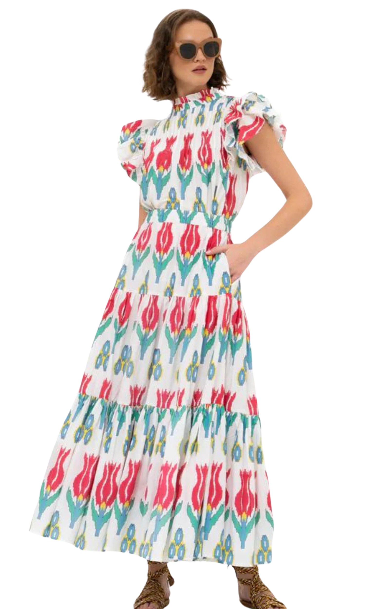 Featuring a lively red flower print, our tiered max skirt effortlessly blends elegance with comfort. Made from lightly structured cotton poplin, it includes practical on-seam side pockets and a flattering fully smocked waist, suitable for various occasions from brunch to an evening dinner.