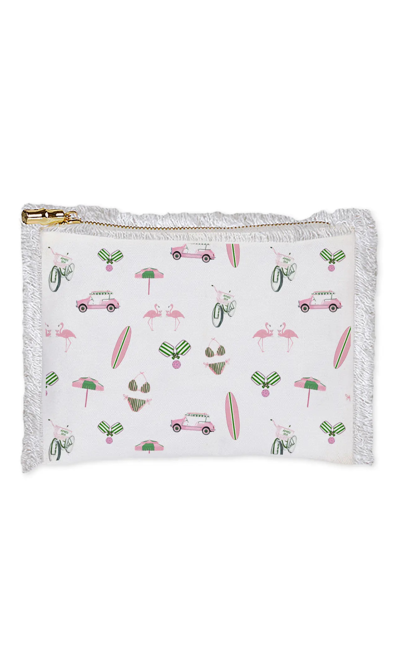 Covered in the sweetest seaside icons, from pink flamingos and striped umbrellas to vintage jeeps, surfboards, and beach bikes, this pouch captures the playful, sun-soaked spirit of a perfect day by the shore. Crafted from durable woven fabric and finished with soft fringe trimming, it brings together style and function in the most effortless way.