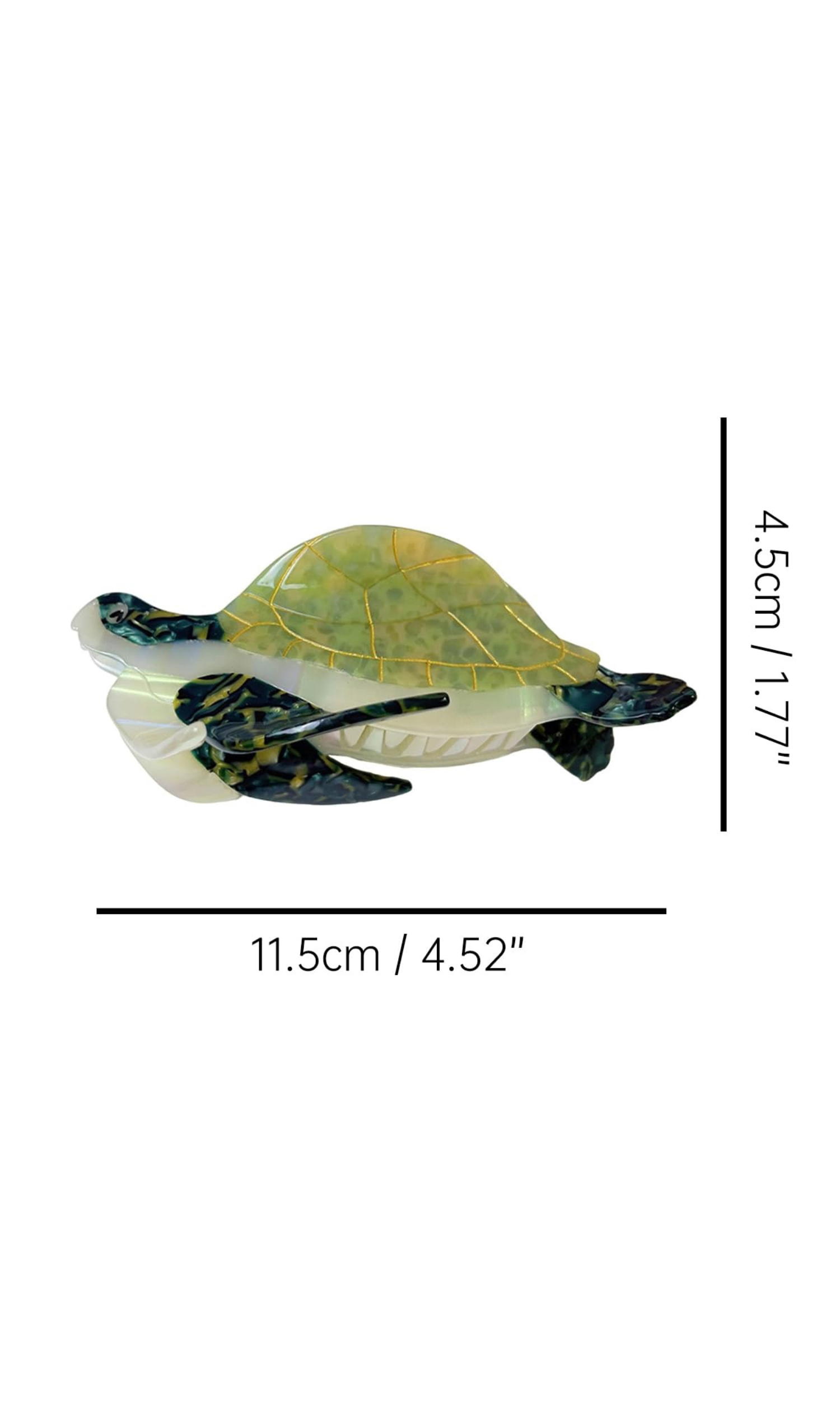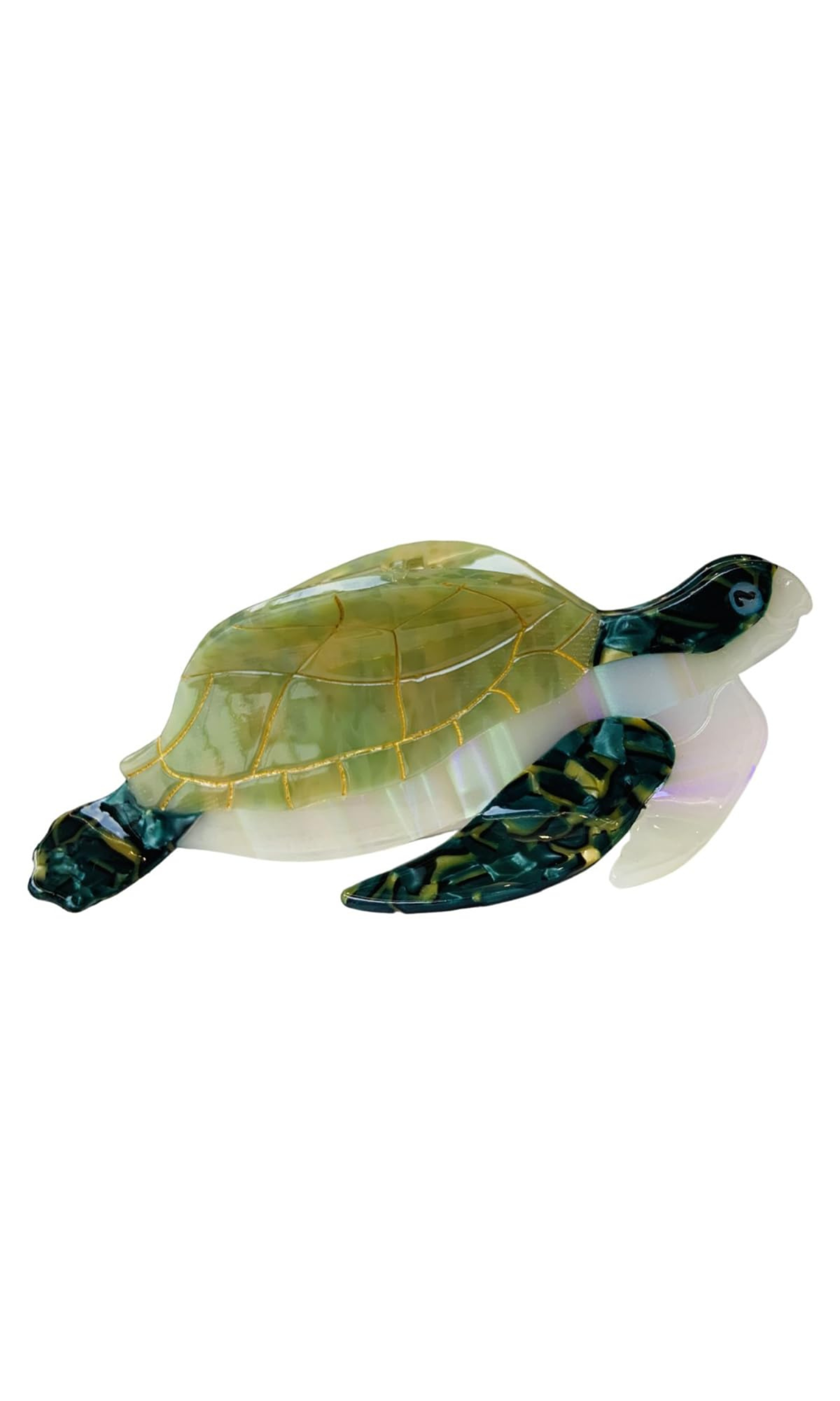Bring a touch of the ocean to your everyday look with this Turtle Hair Claw Clip, inspired by carefree beach days and island living. Crafted with a glossy, marbled finish in soothing sea-glass tones, this clip features a beautifully detailed turtle design with subtle gold accents for an extra hint of luxury.